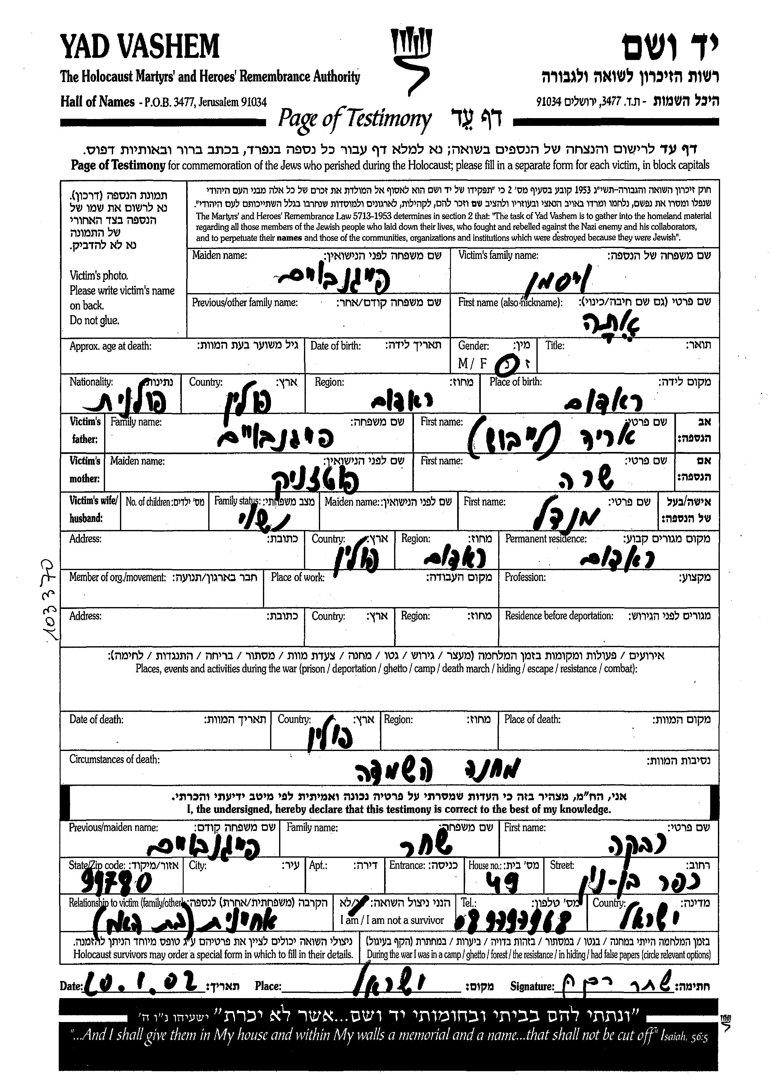 Ester Veisman, geb. Feigenbaum wurde in Radom, Polen geboren. Sie war die Tochter von Arie Leibush und Sara. Sie war mit Mendel Verheiratet. Vor dem Zweiten Weltkrieg lebte sie in Radom, Polen.