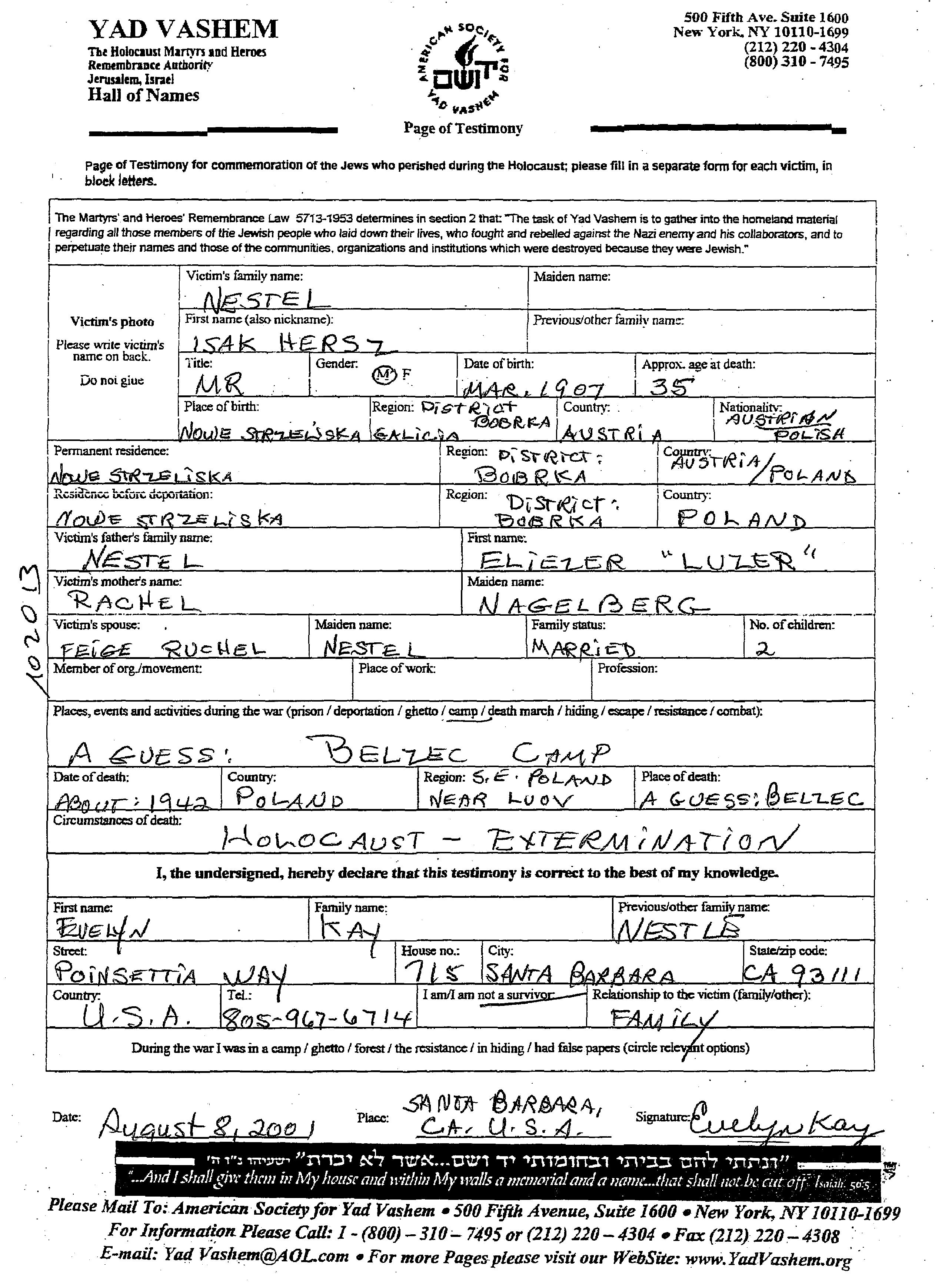 Isak Hersz Nestel wurde im Jahr 1907 in Strzeliska Nowe, Polen geboren. Er war der Sohn von Luzer und Rachel. Er war mit Feiga Ruchel Verheiratet. Vor dem Zweiten Weltkrieg lebte er in Strzeliska Nowe, Polen. Während des Krieges war er in Strzeliska Nowe, Polen.