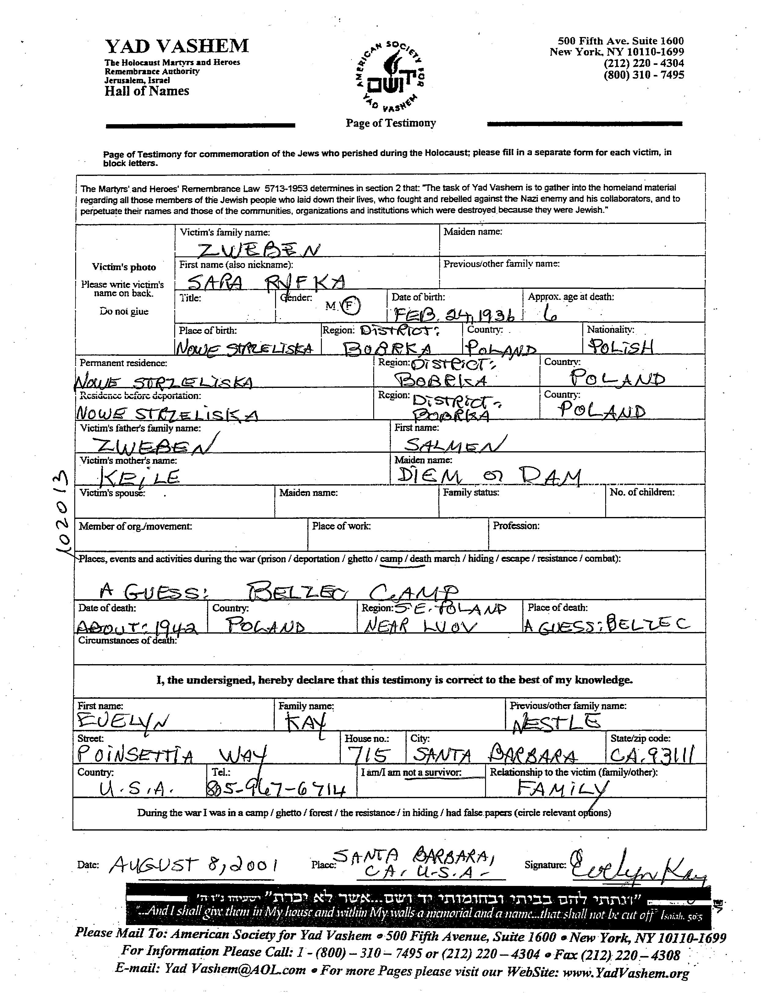 Sara Ryfka Zweben wurde im Jahr 1936 in Strzeliska Nowe, Polen geboren. Sie war die Tochter von Salmen und Keila. Sie war Kind. Vor dem Zweiten Weltkrieg lebte sie in Strzeliska Nowe, Polen. Während des Krieges war sie in Strzeliska Nowe, Polen.