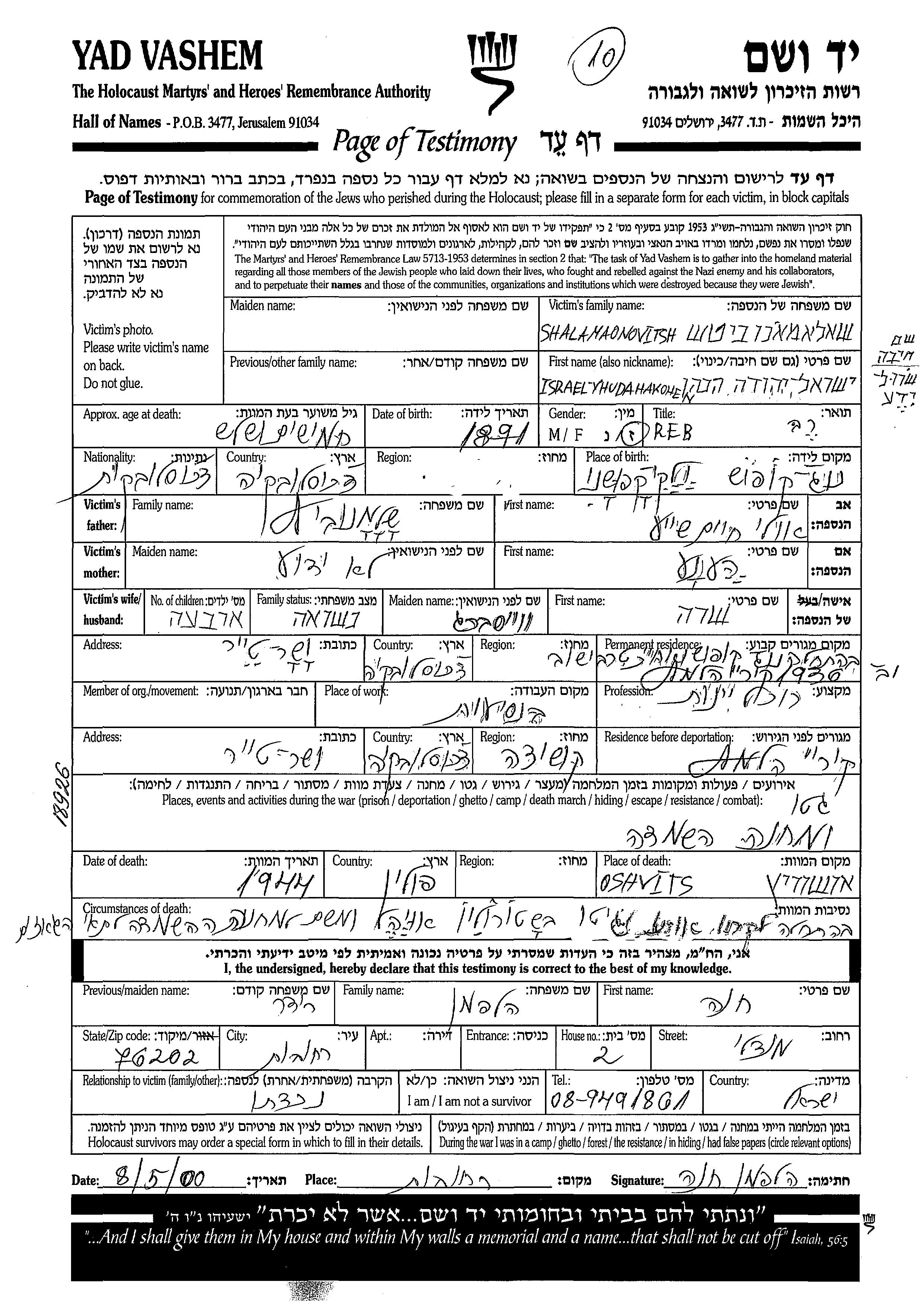Israel Yhuda Shalamaonovitsh Hakohen wurde im Jahr 1891 in Nagy Kapos, Tschechoslowakei geboren. Er war der Sohn von Khaim Shiye und Fania. Er war Hausierer/-in und mit Sara, geb. Veisberg Verheiratet. Vor dem Zweiten Weltkrieg lebte er in Trebisov, Tschechoslowakei. Während des Krieges war er in Kiraly Helmec, Tschechoslowakei.