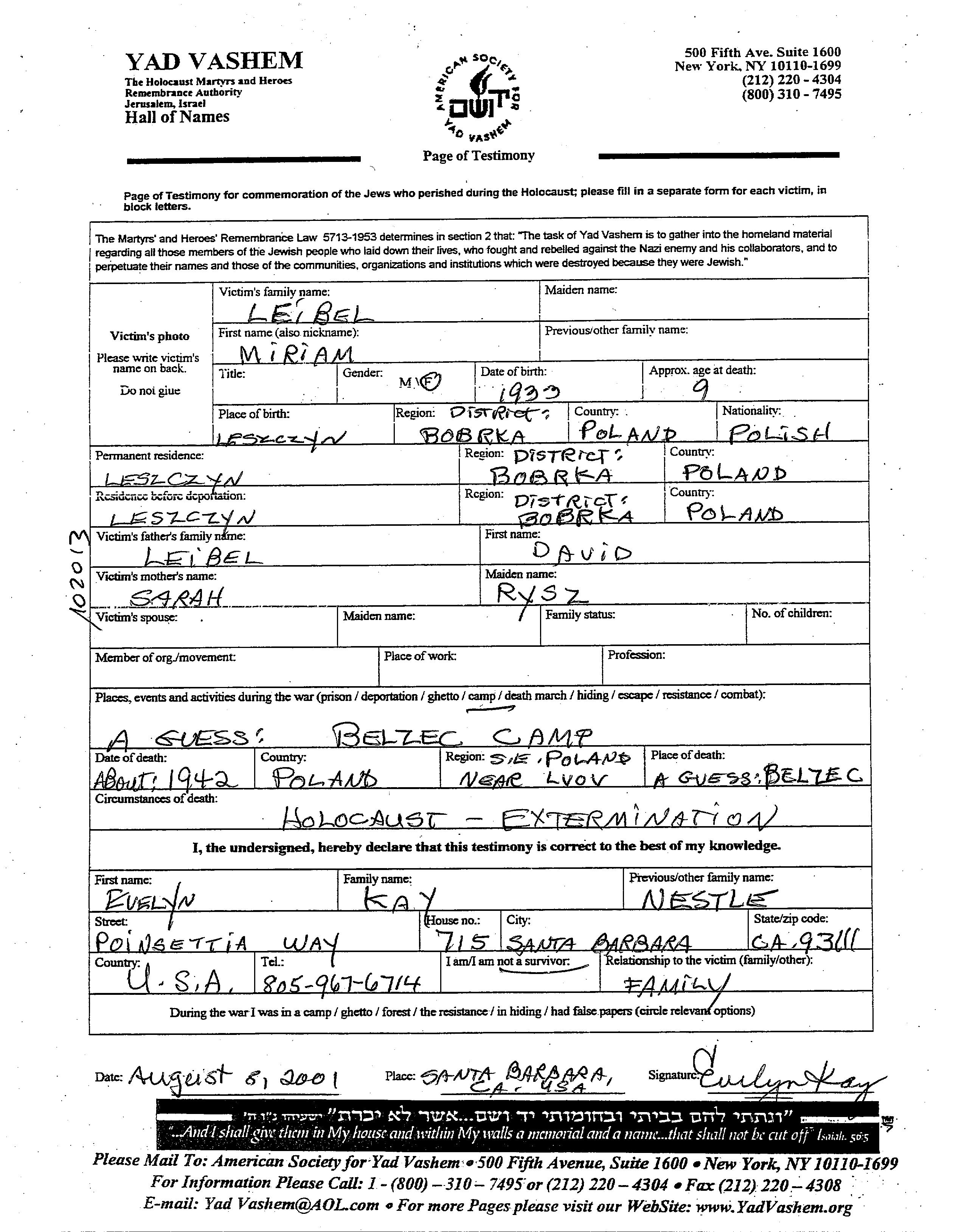 Miriam Leibel wurde im Jahr 1933 in Leszczyn, Polen geboren. Sie war die Tochter von David und Sarah. Sie war Kind. Vor dem Zweiten Weltkrieg lebte sie in Leszczyn, Polen. Während des Krieges war sie in Leszczyn, Polen.