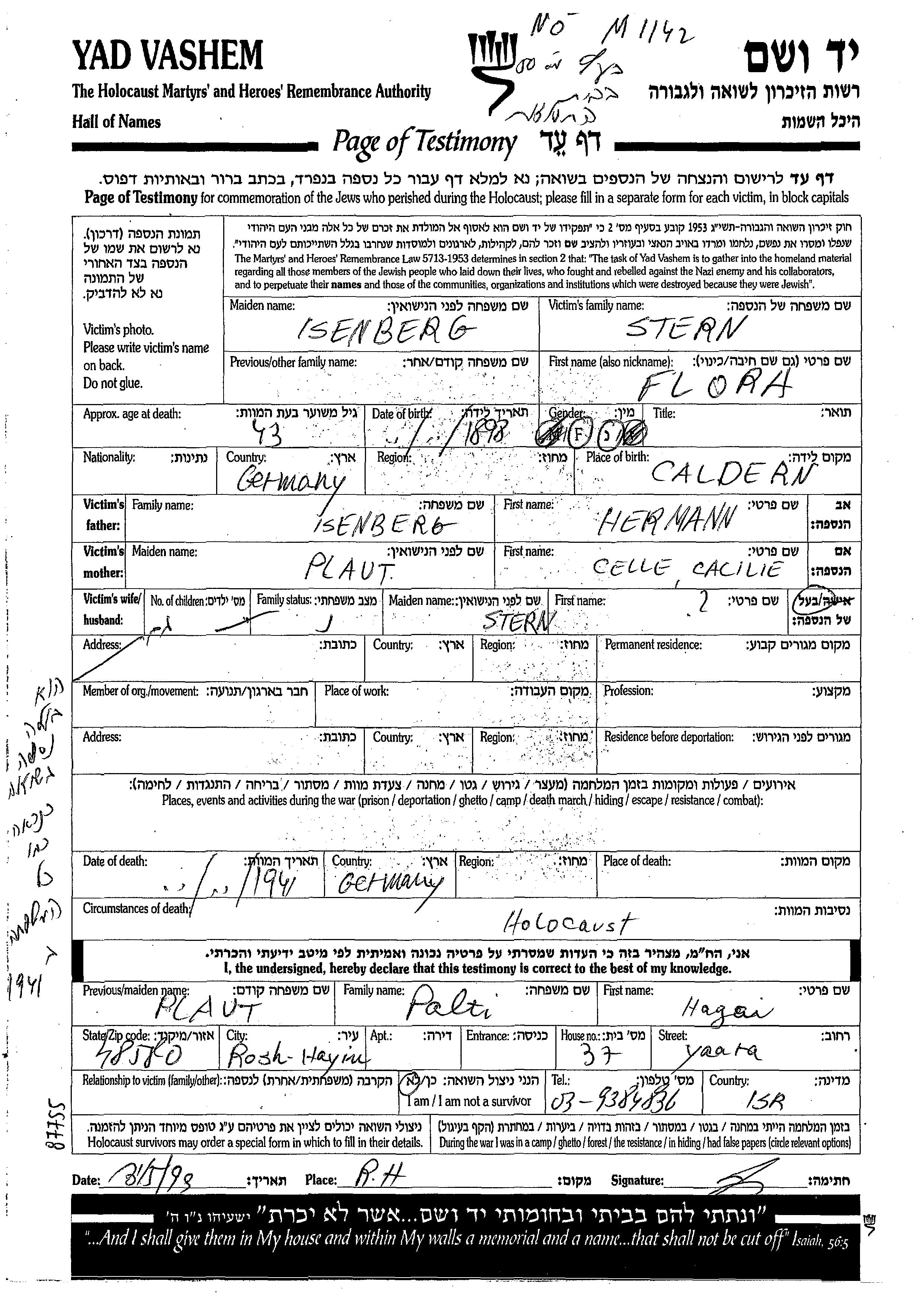 Flora Stern, geb. Isenberg wurde im Jahr 1898 in Caldern, Deutsches Reich geboren. Sie war die Tochter von Hermann und Celle. Sie war Verheiratet. Vor dem Zweiten Weltkrieg lebte sie in Caldern, Deutsches Reich.