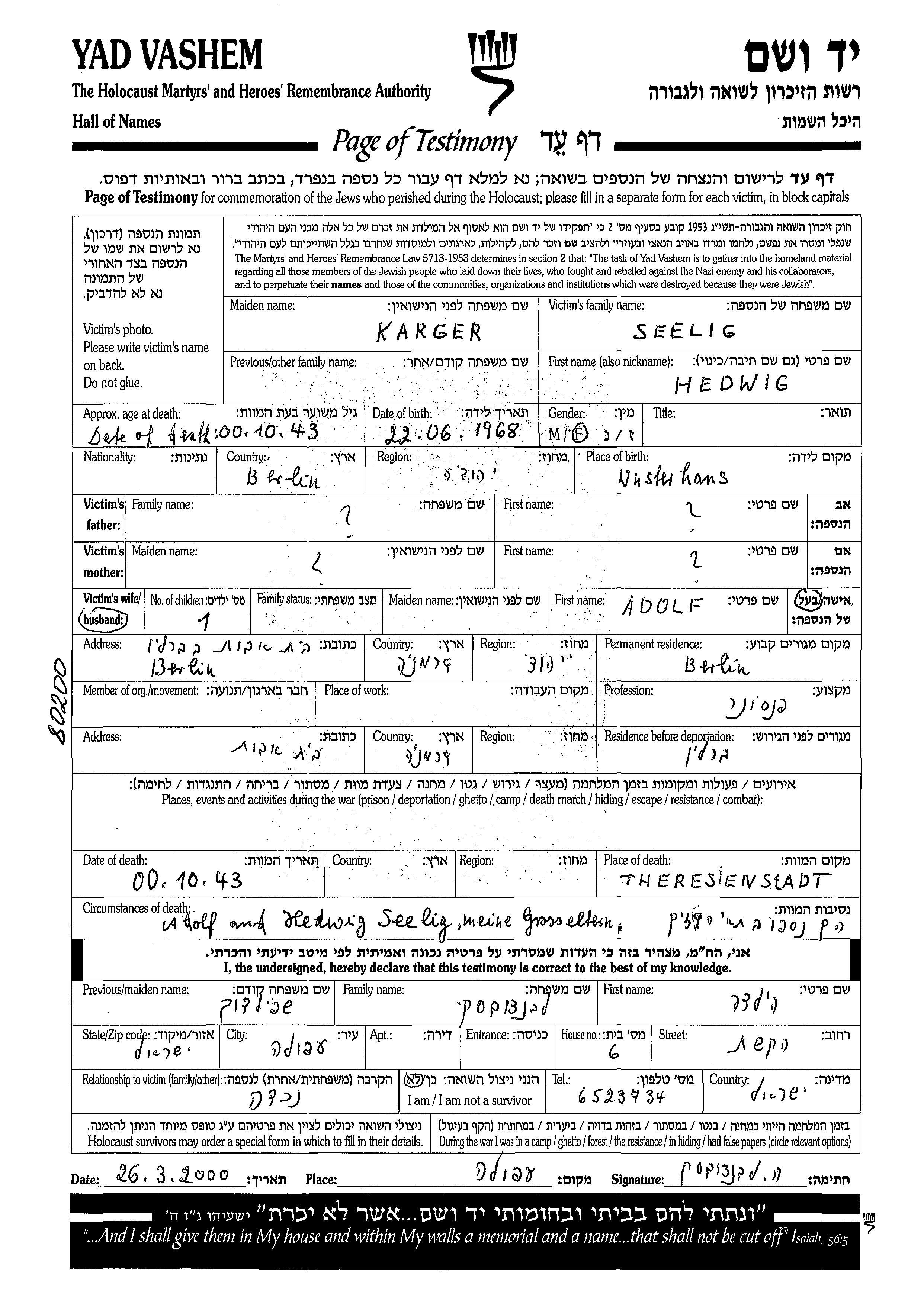 Hedwig Seelig, geb. Karger wurde in Berlin, Deutsches Reich geboren. Sie war Rentner/-in und mit Adolf Verheiratet. Vor dem Zweiten Weltkrieg lebte sie in Berlin, Deutsches Reich. Während des Krieges war sie in Berlin, Deutsches Reich.