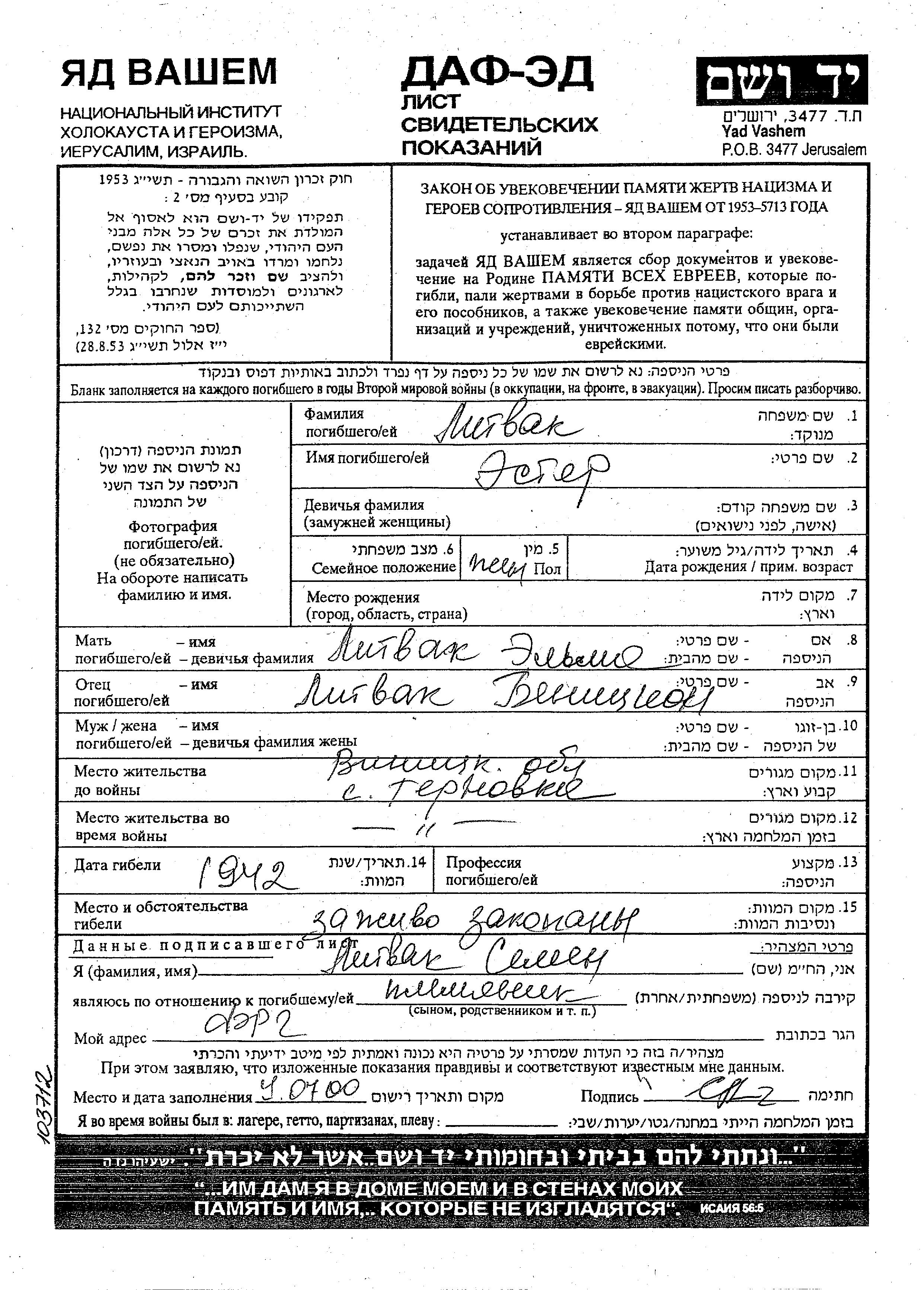 Litvak Ester Ternovka, Ukraine (UdSSR) Gedenkblatt