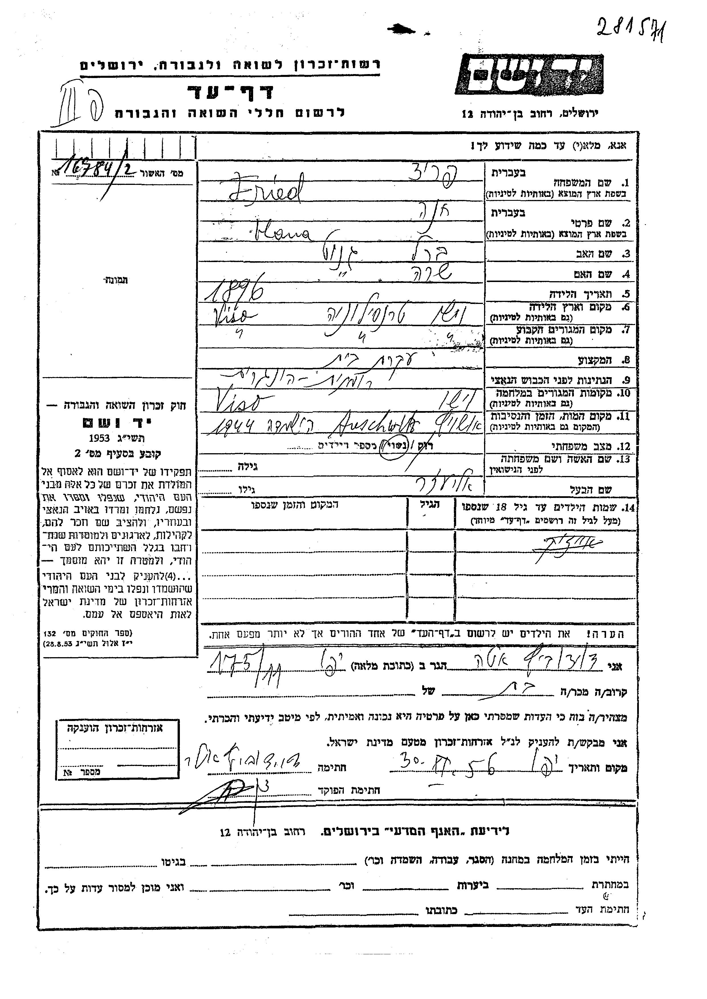 Khana Fried, geb. Genut wurde im Jahr 1896 in Viso, Rumänien geboren. Sie war die Tochter von Berl und Sara. Sie war Hausfrau und mit Eliezer Verheiratet. Vor dem Zweiten Weltkrieg lebte sie in Viso, Rumänien. Während des Krieges war sie in Viso, Rumänien.