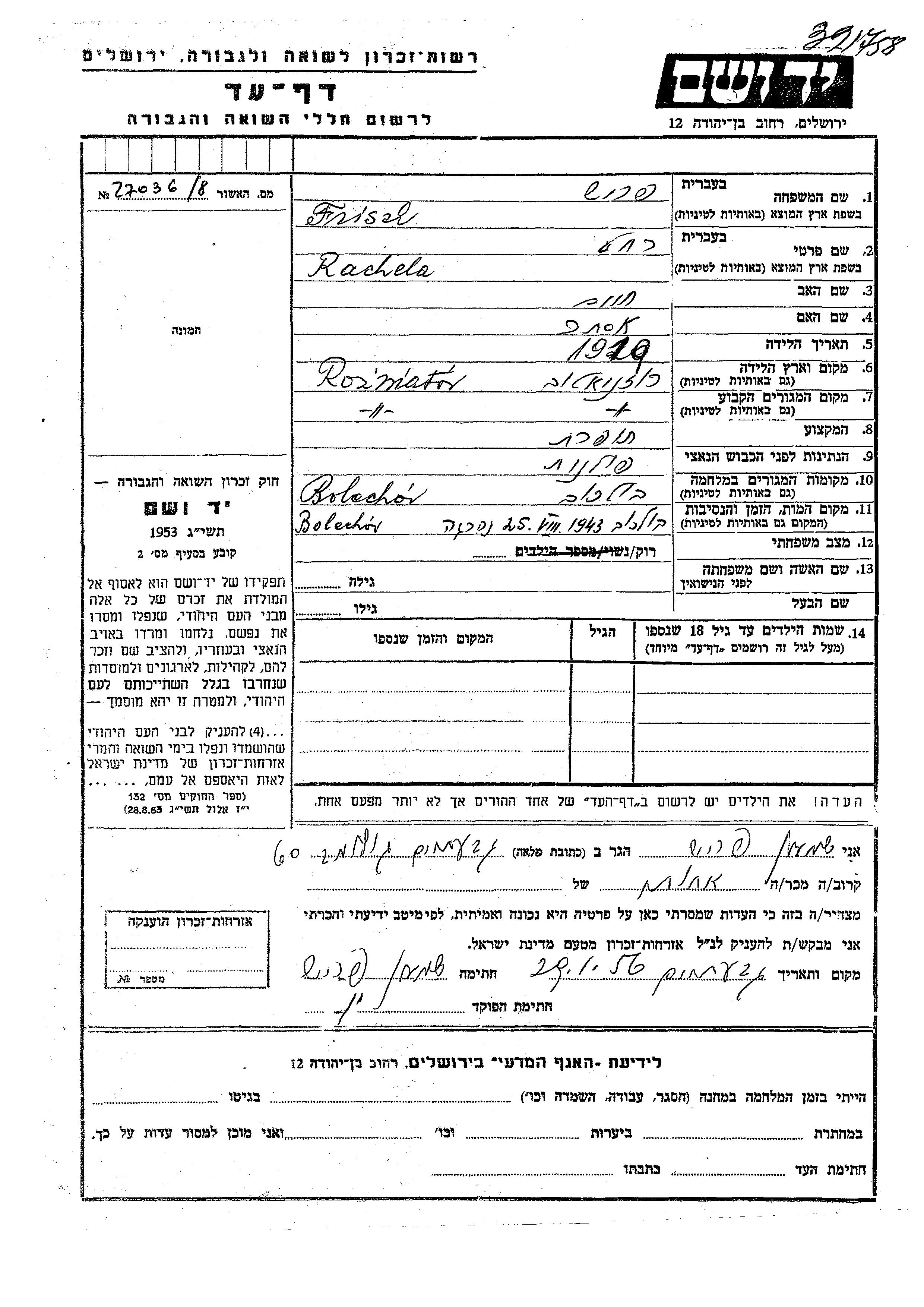 Rachela Frisch wurde im Jahr 1919 in Rożniatów, Polen geboren. Sie war die Tochter von Khaim und Ester. Sie war Schneiderin und Ledig. Vor dem Zweiten Weltkrieg lebte sie in Rożniatów, Polen. Während des Krieges war sie in Bolechov, Polen.