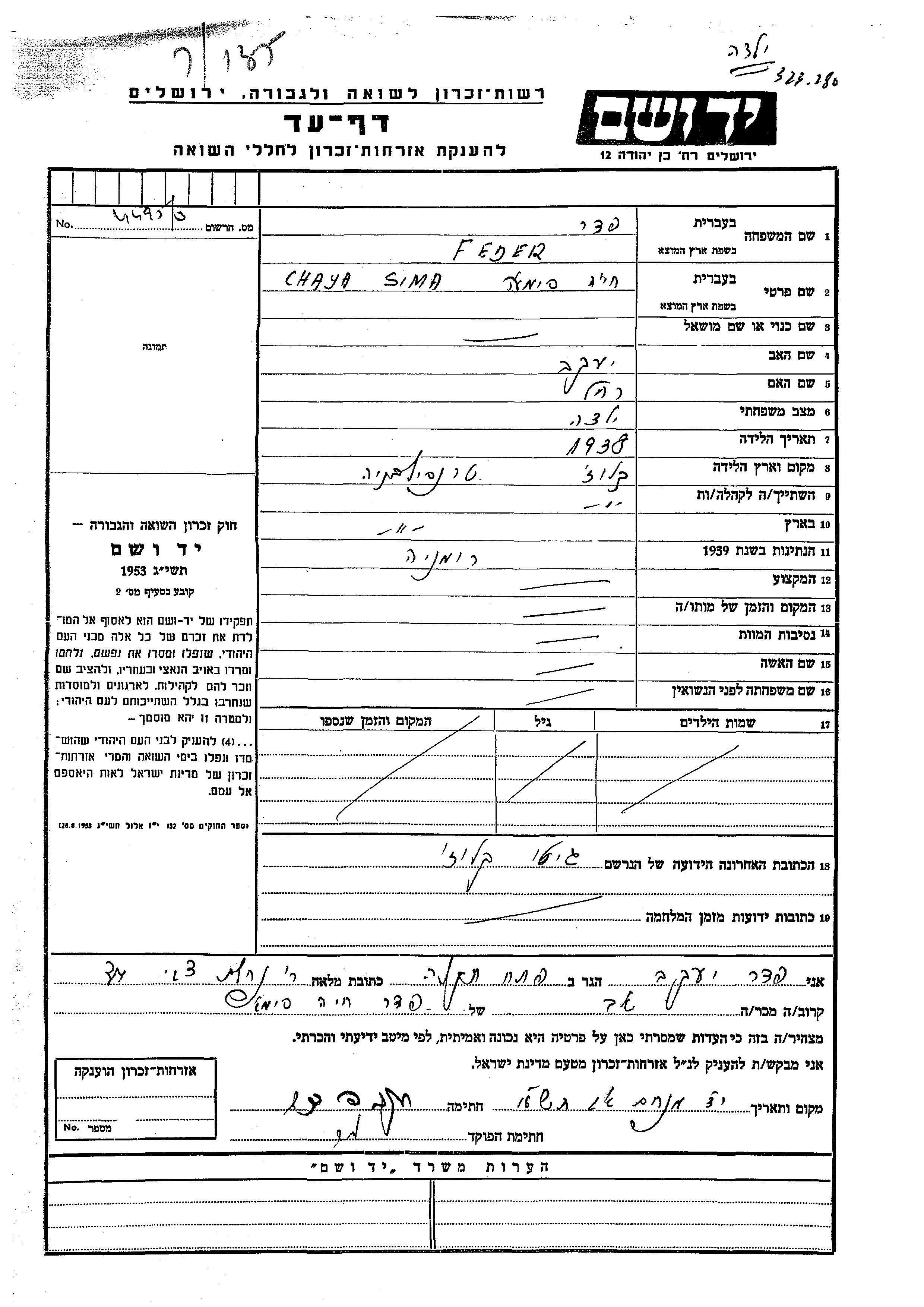 Chaya Sima Feder wurde im Jahr 1938 in Kluzh, Rumänien geboren. Sie war die Tochter von Yaakov und Rakhel. Sie war Ledig. Vor dem Zweiten Weltkrieg lebte sie in Kluzh, Rumänien. Während des Krieges war sie in Kluzh, Rumänien.