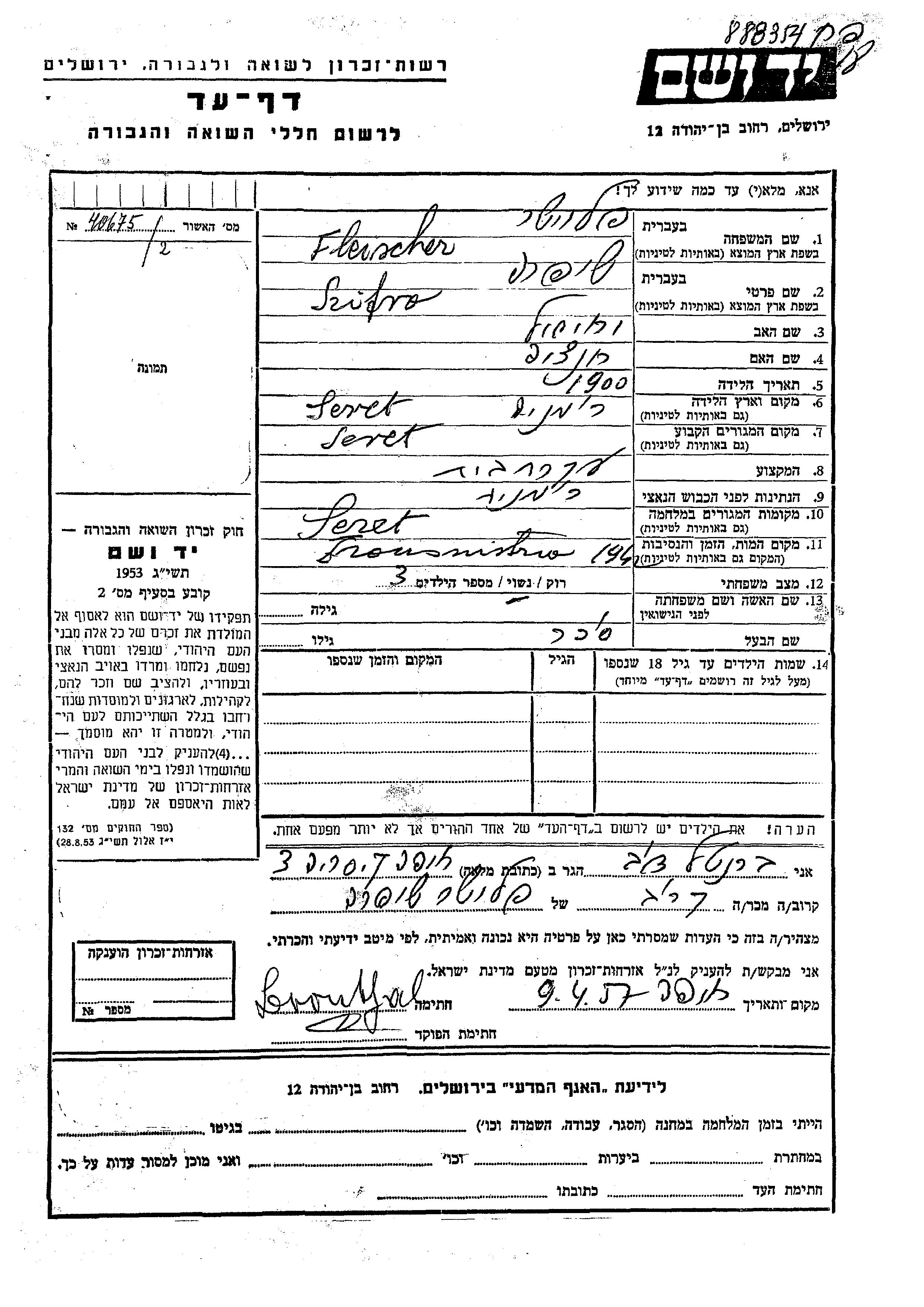 Szifra Fleischer wurde im Jahr 1900 in Seret, Rumänien geboren. Sie war die Tochter von Yekhiel und Khana. Sie war Hausfrau und mit Issakhar Verheiratet. Vor dem Zweiten Weltkrieg lebte sie in Seret, Rumänien. Während des Krieges war sie in Seret, Rumänien.