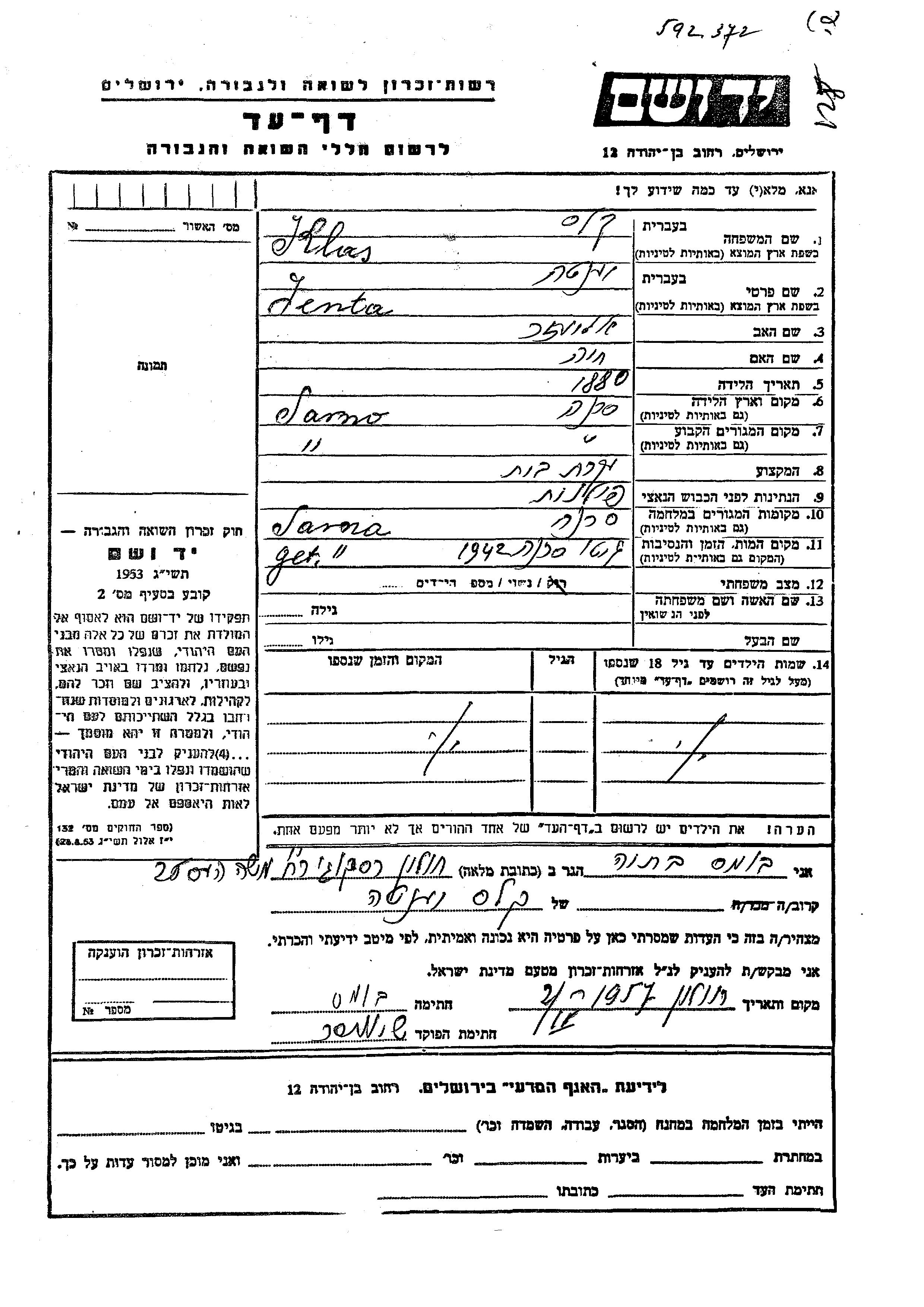 Yenta Klas Kles wurde im Jahr 1880 in Sarna, Polen geboren. Sie war die Tochter von Eliezer und Khaia. Sie war Hausfrau und Verheiratet. Vor dem Zweiten Weltkrieg lebte sie in Sarna, Polen. Während des Krieges war sie in Sarna, Polen.
