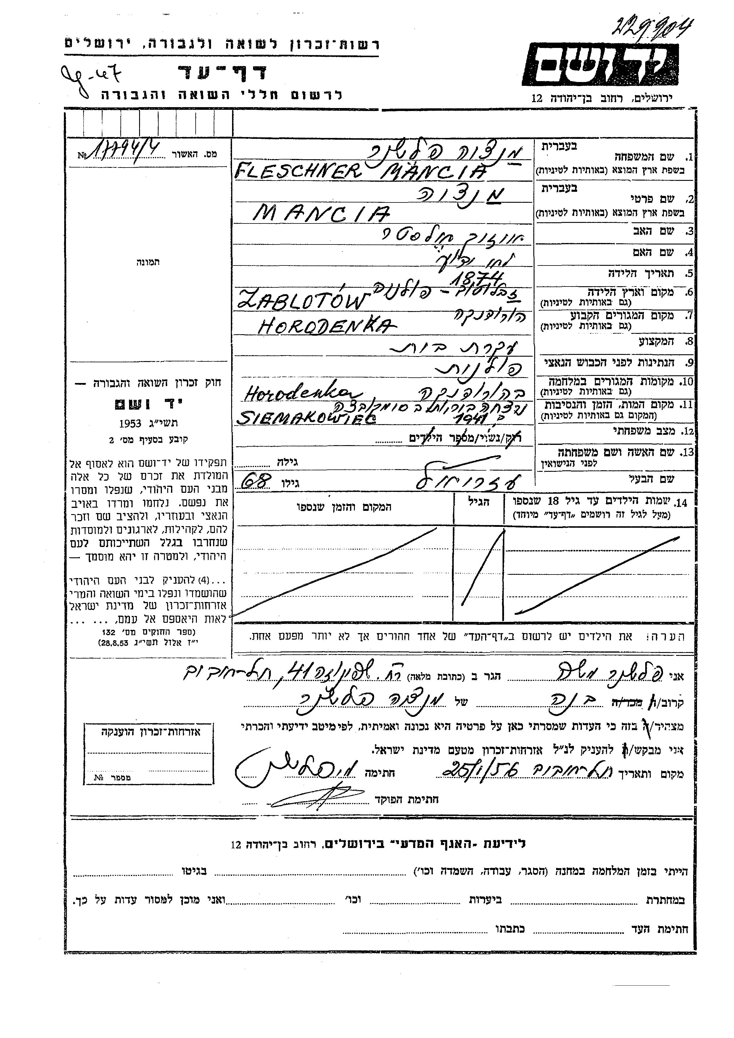 Mancia Fleschner, geb. Elster wurde im Jahr 1874 in Zablotow, Polen geboren. Sie war die Tochter von Aizik. Sie war Hausfrau und mit Azriel Verheiratet. Vor dem Zweiten Weltkrieg lebte sie in Horodenka, Polen. Während des Krieges war sie in Horodenka, Polen.