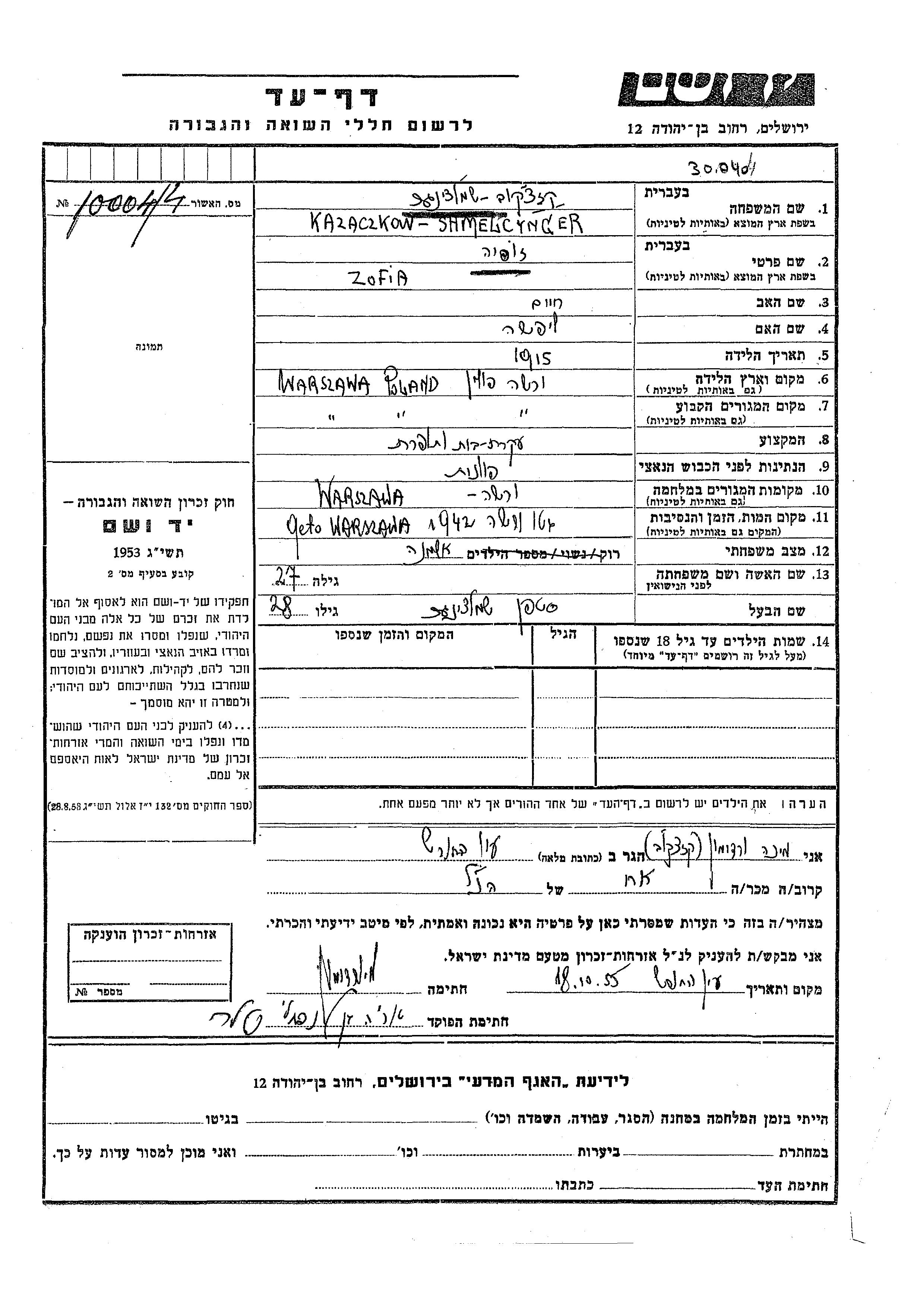 Zofia Shmelcynger, geb. Kazaczkow wurde im Jahr 1915 in Warszawa, Polen geboren. Sie war die Tochter von Khaim und Lifsha. Sie war Hausfrau und mit Stefan Witwe. Vor dem Zweiten Weltkrieg lebte sie in Warszawa, Polen. Während des Krieges war sie in Warszawa, Polen.