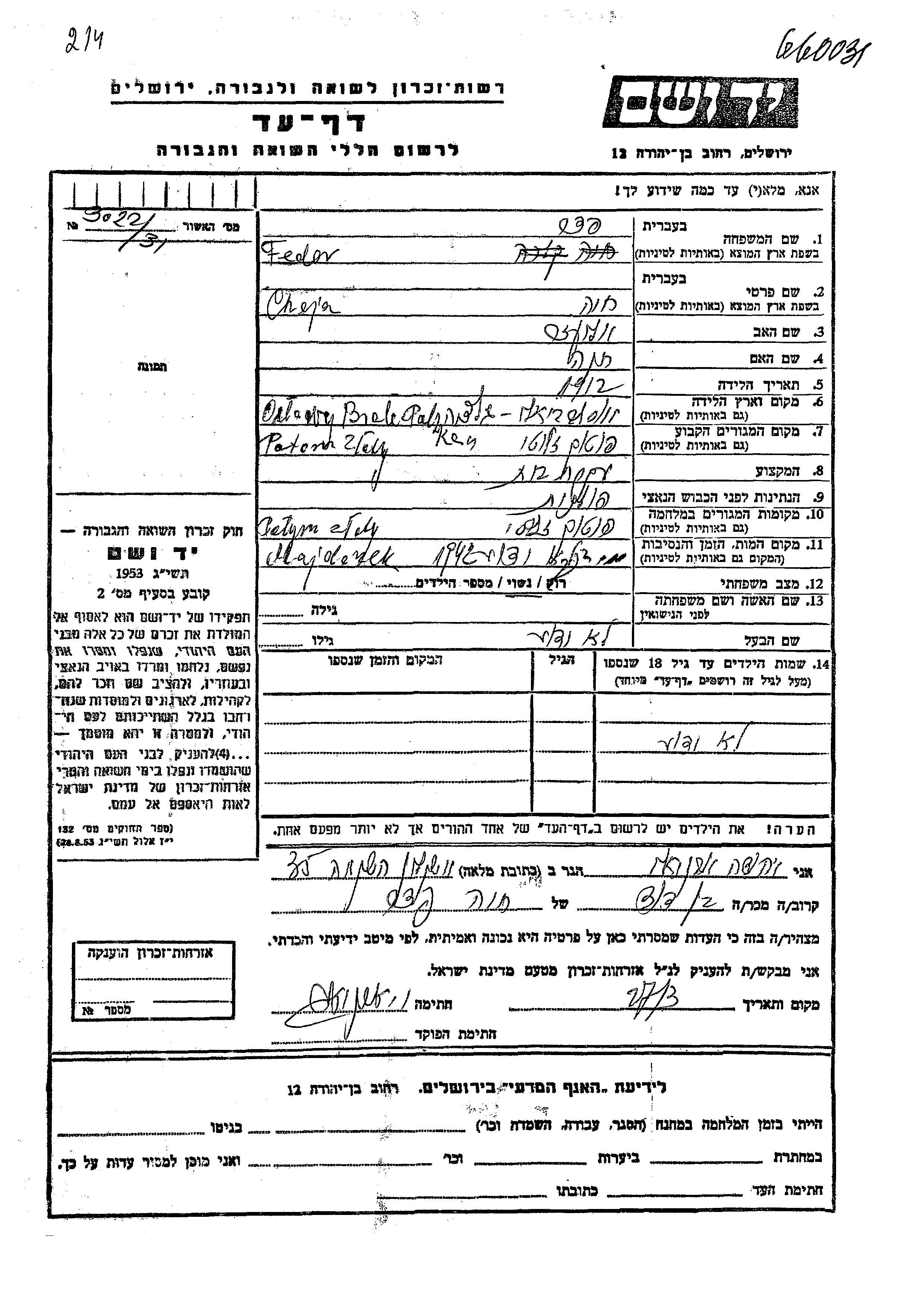 Chaja Feder wurde im Jahr 1912 in Oslaw Bialy, Polen geboren. Sie war die Tochter von Eliezer und Khana. Sie war Hausfrau und Verheiratet. Vor dem Zweiten Weltkrieg lebte sie in Potok Zloty, Polen. Während des Krieges war sie in Potok Zloty, Polen.