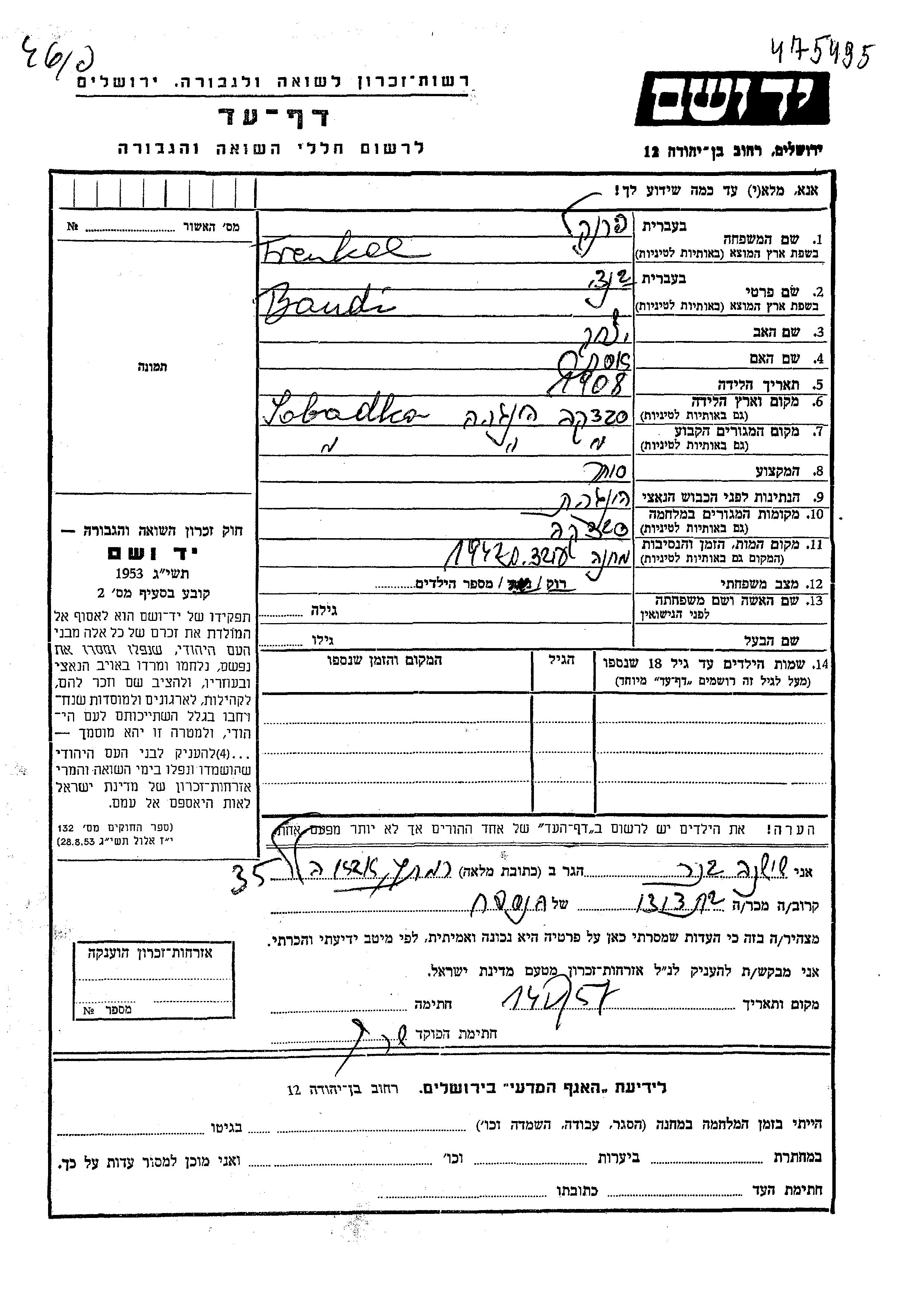 Bandi Frenkel wurde im Jahr 1908 in Sobadka, Jugoslawien geboren. Er war der Sohn von Yitzkhak und Ester. Er war Kaufmann/-frau und Ledig. Vor dem Zweiten Weltkrieg lebte er in Sobadka, Jugoslawien. Während des Krieges war er in Sobadka, Jugoslawien.