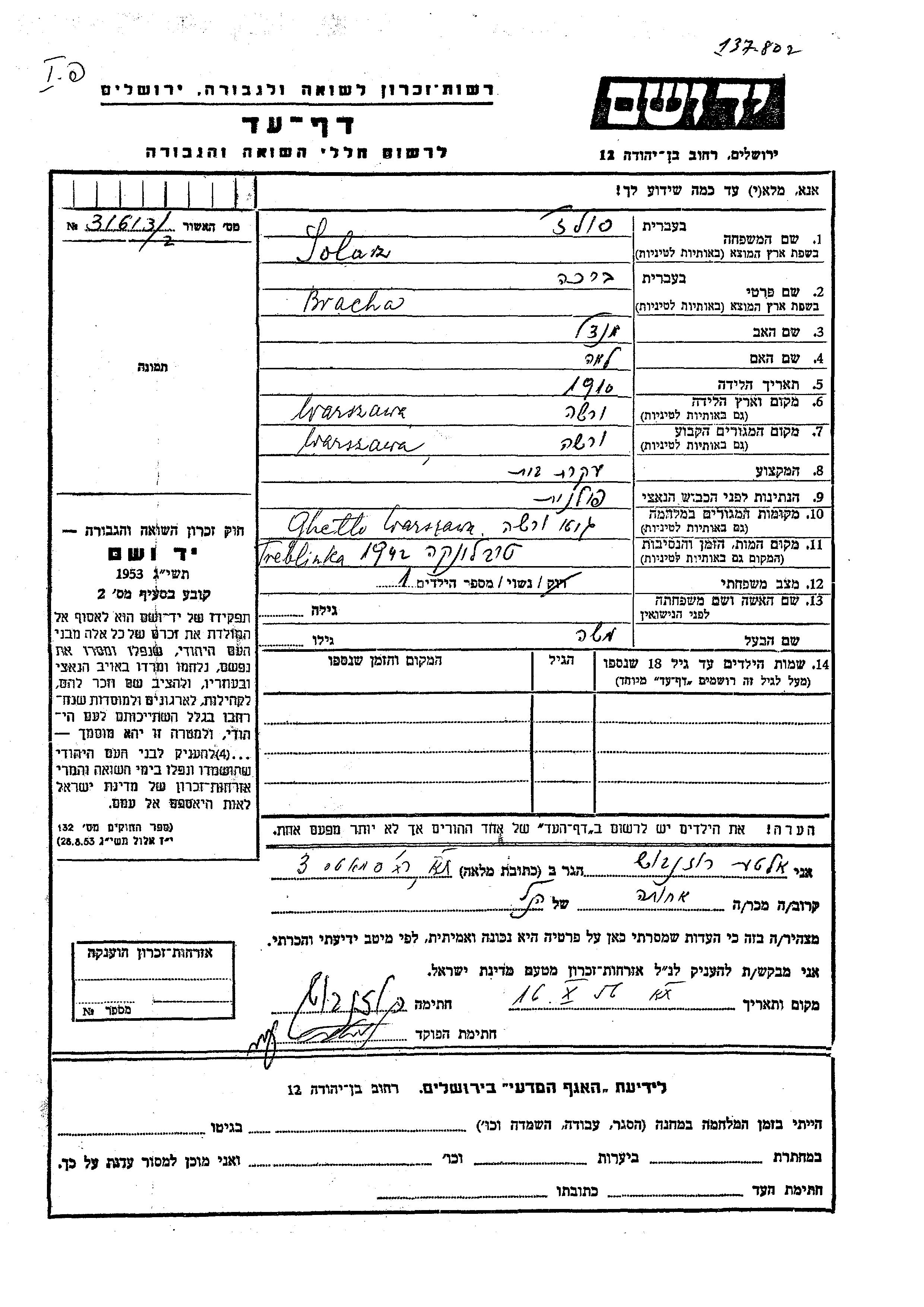 Bracha Solaz wurde im Jahr 1910 in Warsaw, Polen geboren. Sie war die Tochter von Mendel und Lea. Sie war Hausfrau und mit Moshe Verheiratet. Vor dem Zweiten Weltkrieg lebte sie in Warsaw, Polen. Während des Krieges war sie in Warsaw, Polen.