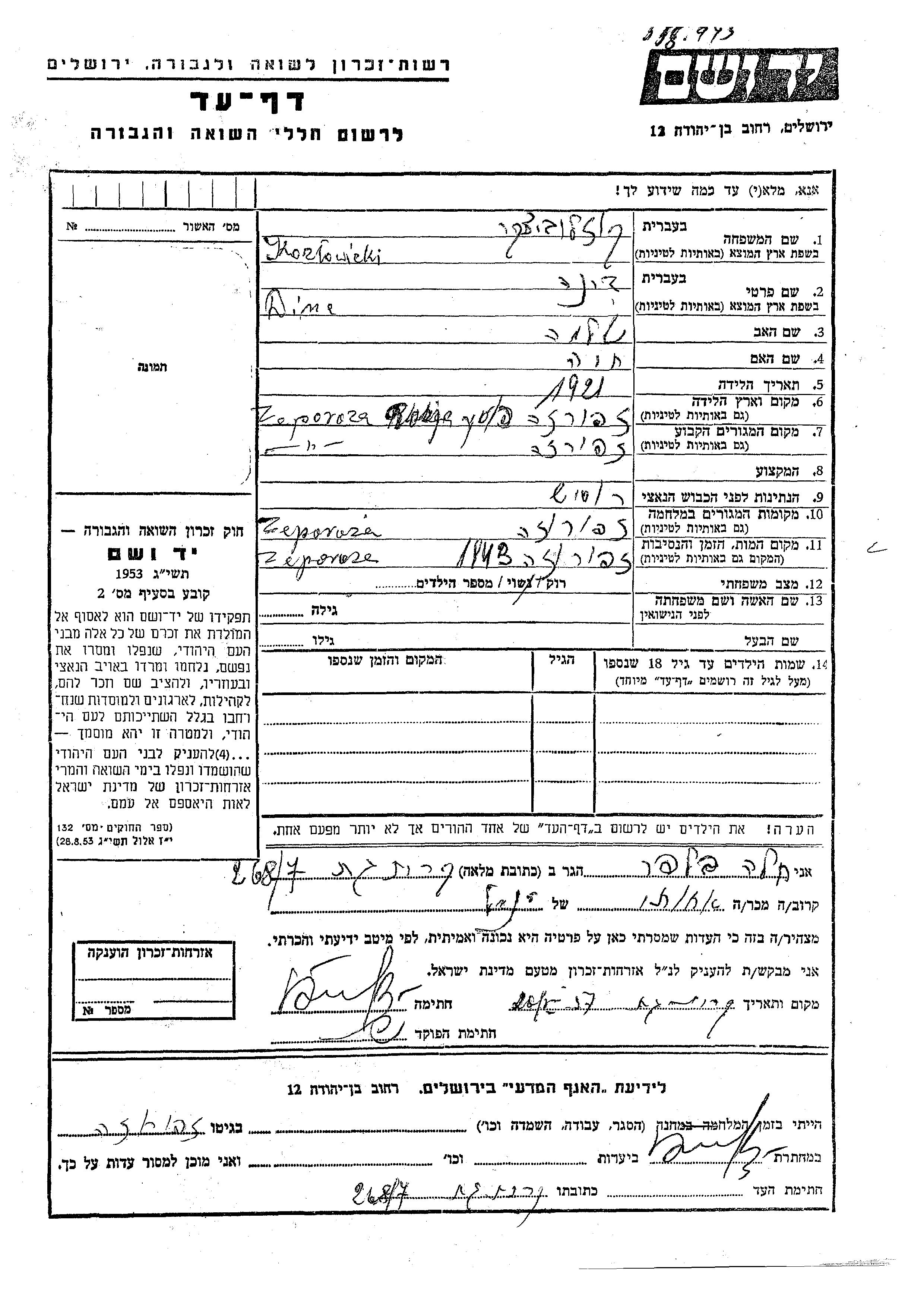 Dine Kozlowicki wurde im Jahr 1921 in Zaporozhe, Ukraine (UdSSR) geboren. Sie war die Tochter von Shlomo und Khaia. Sie war Ledig. Vor dem Zweiten Weltkrieg lebte sie in Zaporozhe, Ukraine (UdSSR). Während des Krieges war sie in Zaporozhe, Ukraine (UdSSR).
