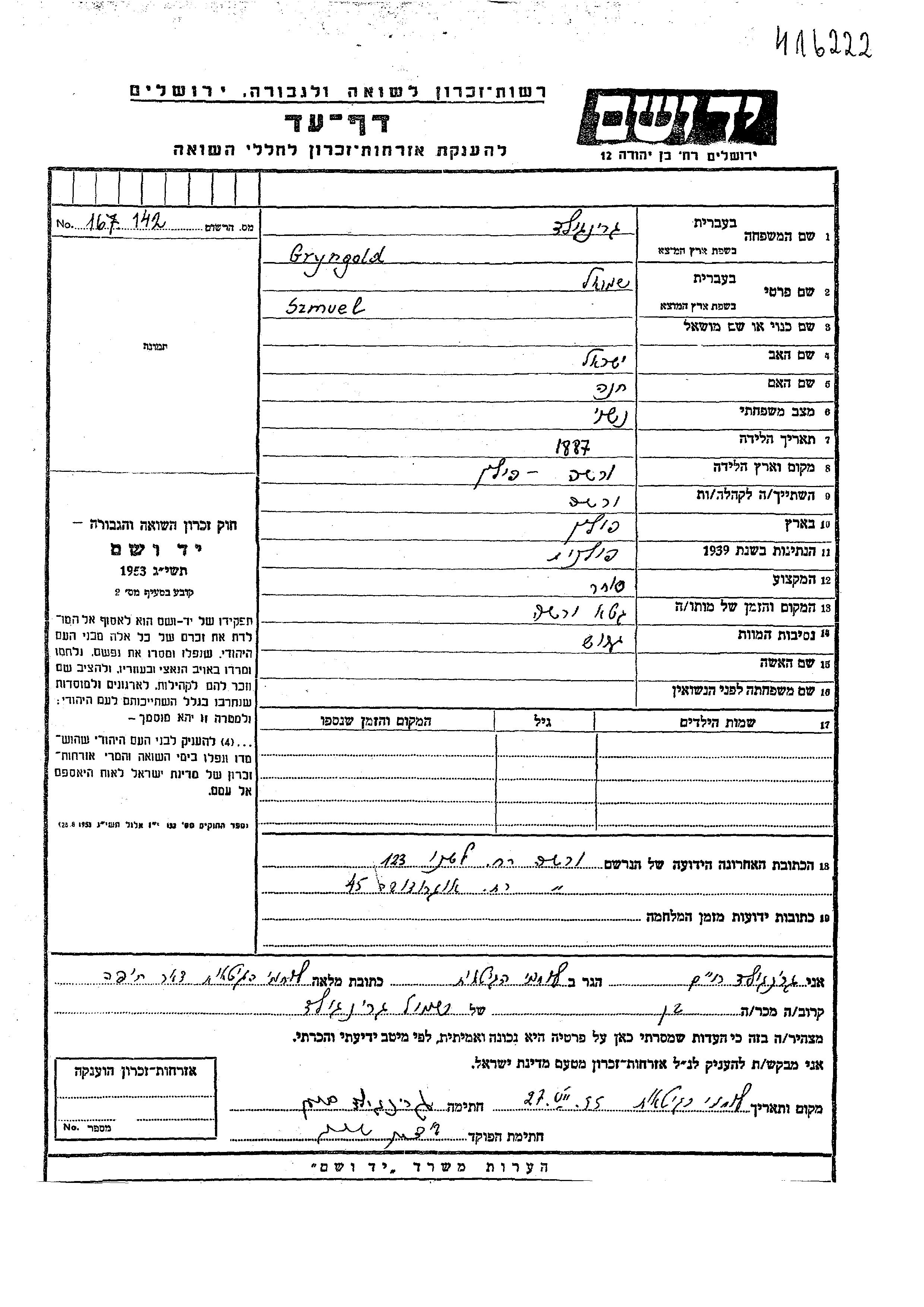 Szmuel wurde in der Schoah ermordet. Todesort: Warszawa, Polen.