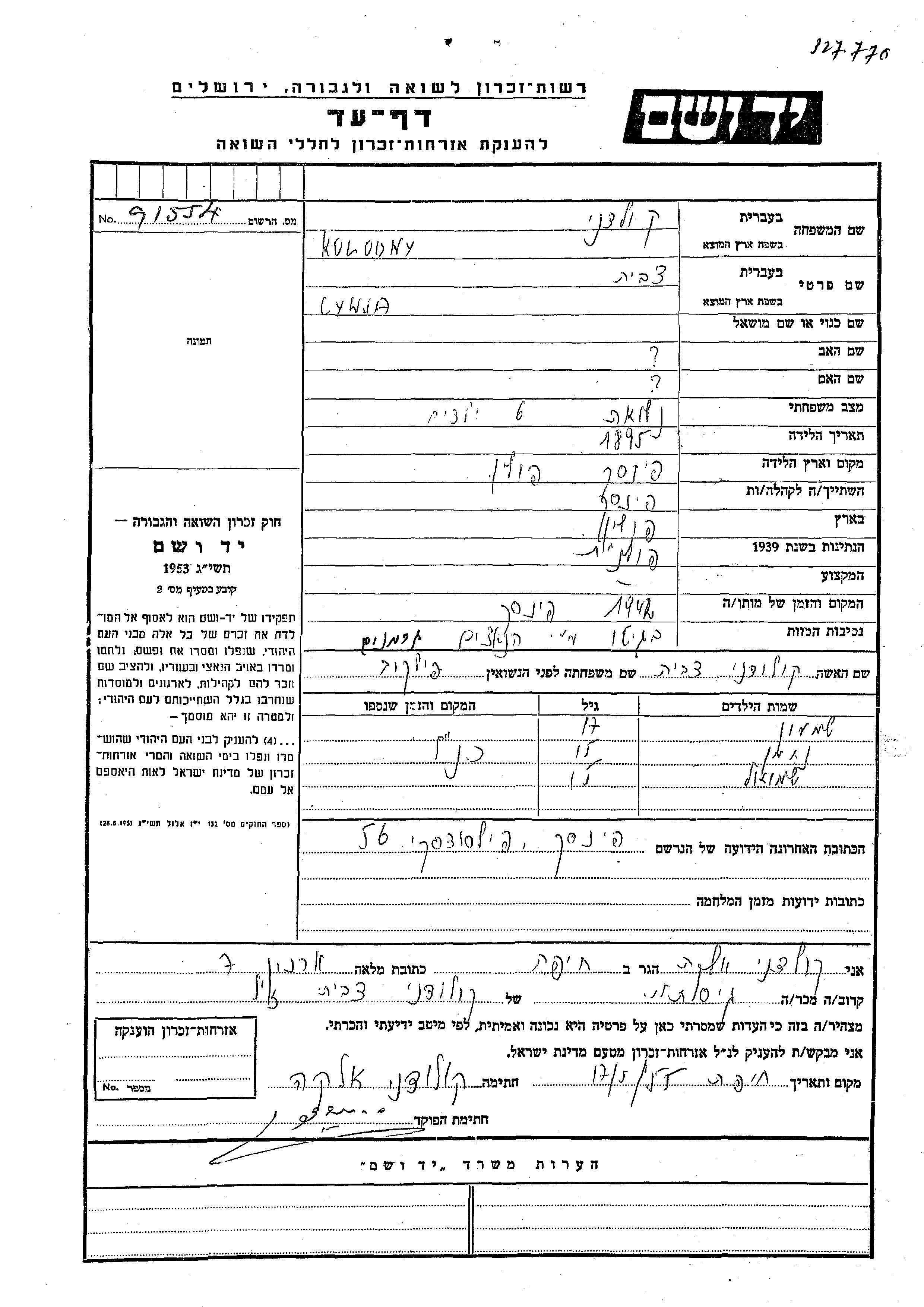 Cywja Kolodny, geb. Pilkov wurde im Jahr 1895 in Pinsk, Polen geboren. Sie war mit Tzvia Verheiratet. Vor dem Zweiten Weltkrieg lebte sie in Pinsk, Polen.