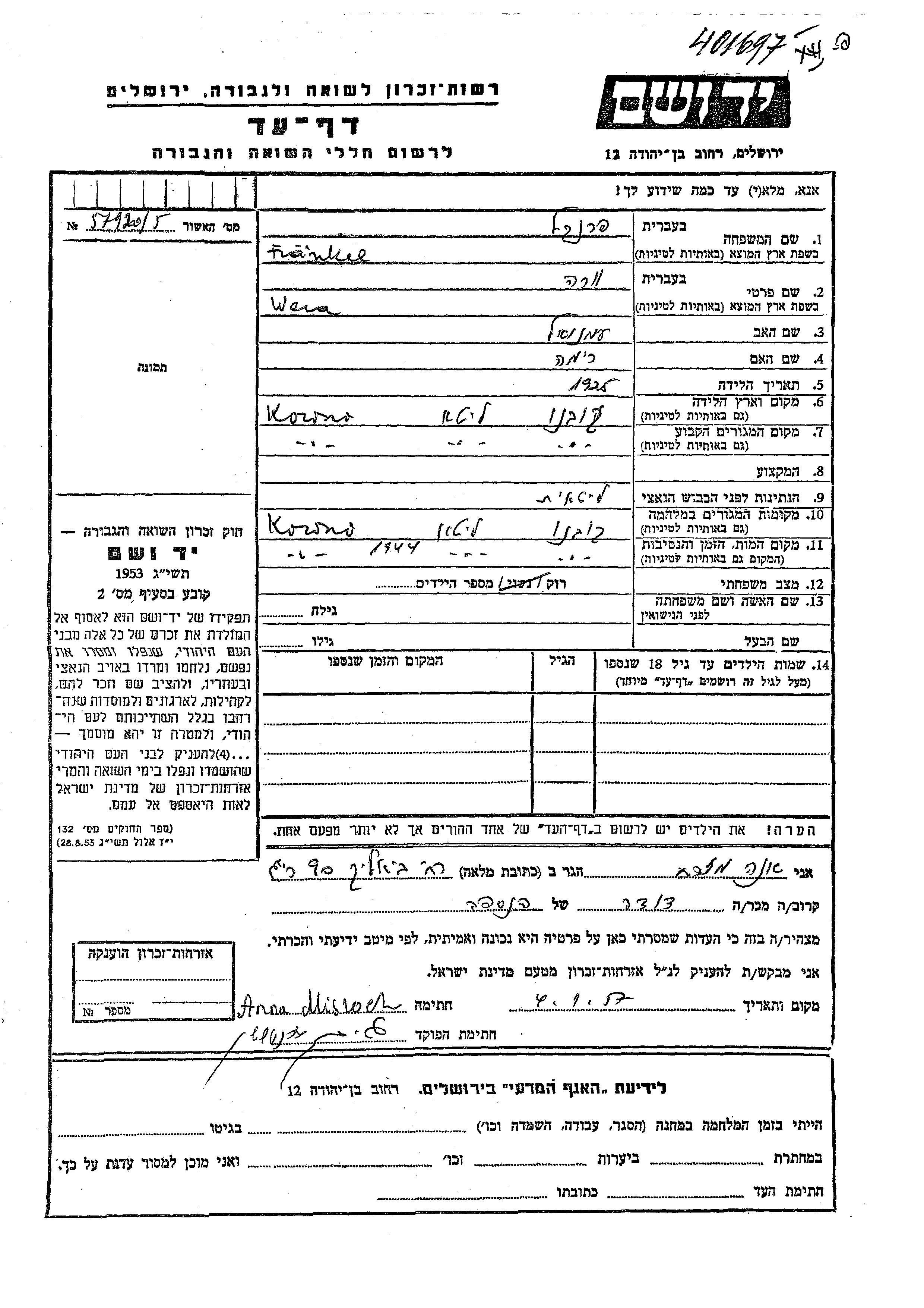 Wera wurde in der Schoah ermordet. Todesort: Kowno, Litauen im Jahr 1944.