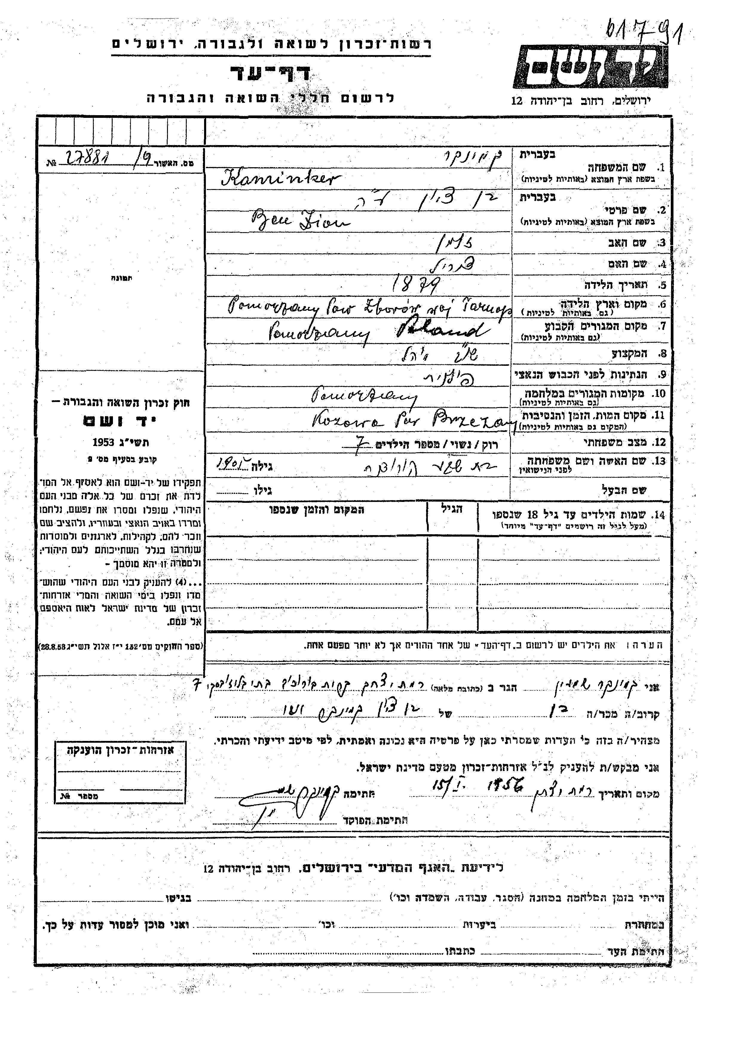 Ben Zion Kaminker wurde im Jahr 1879 in Pomorzany, Polen geboren. Er war der Sohn von Zalman und Tziril. Er war Schächter und fleischbeschauer und mit Batsheva, geb. Horodner Verheiratet. Vor dem Zweiten Weltkrieg lebte er in Pomorzany, Polen. Während des Krieges war er in Pomorzany, Polen.