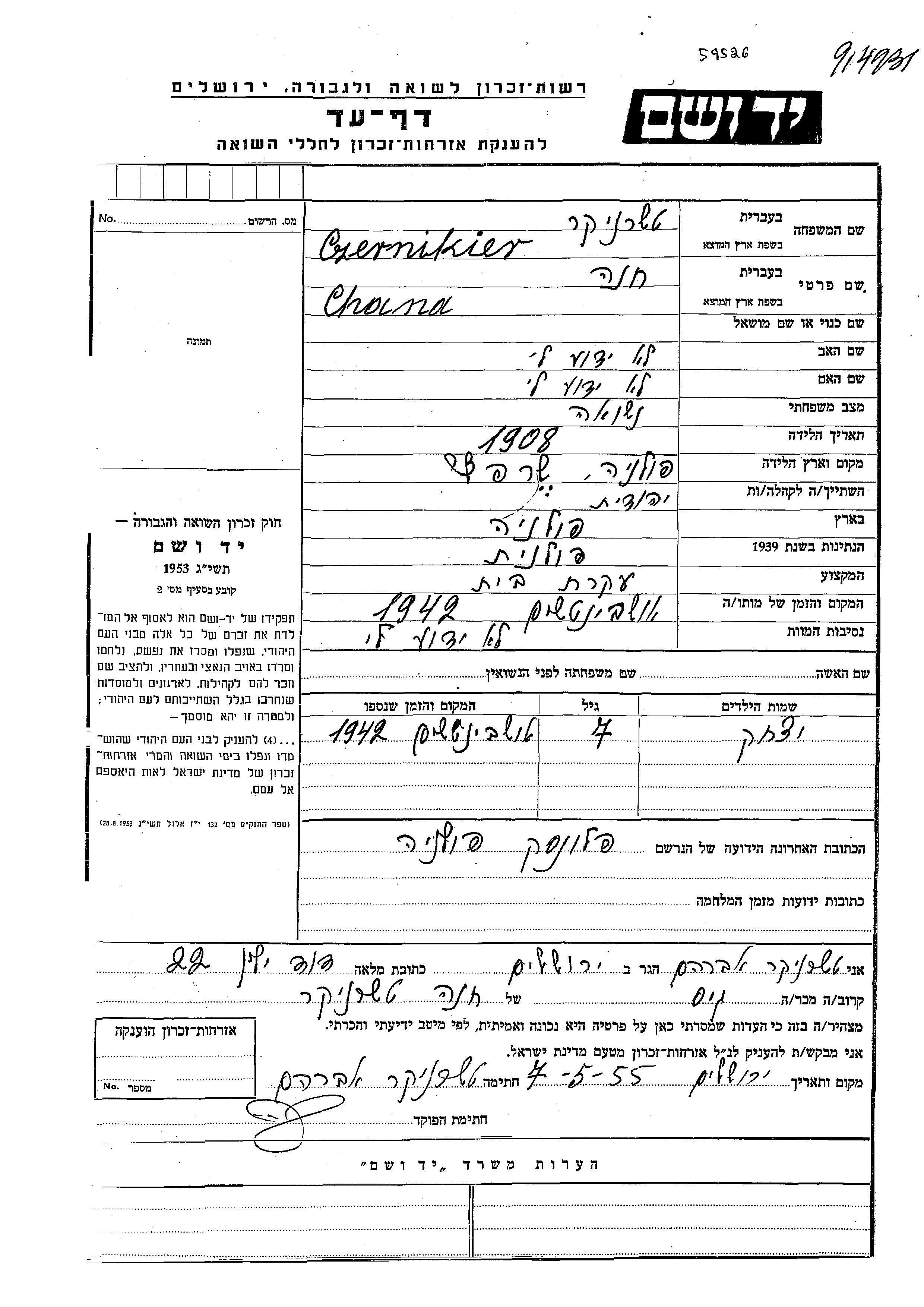 Chana Czernikier wurde im Jahr 1908 in Sierpc, Polen geboren. Sie war Hausfrau und Verheiratet.