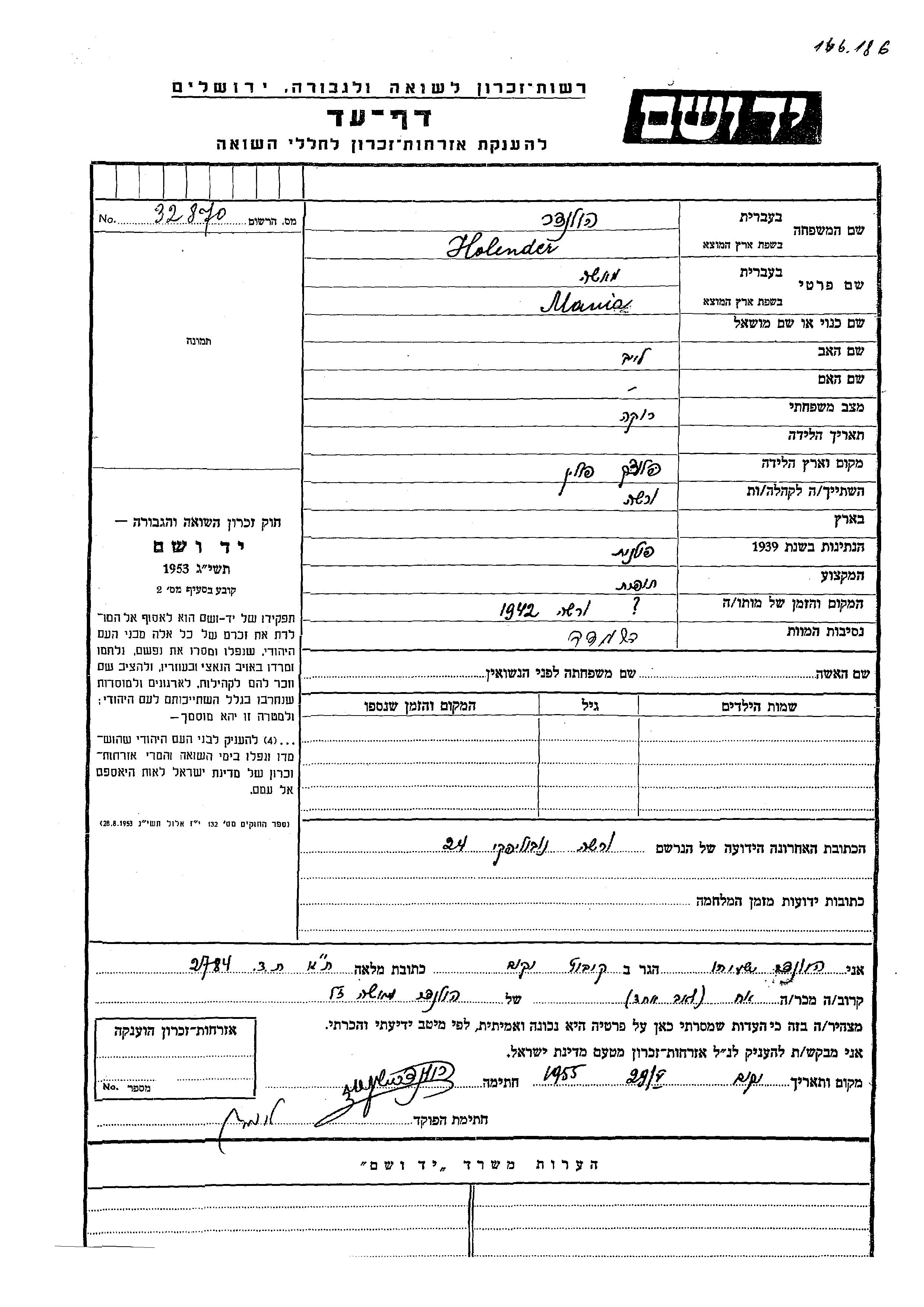 Mania Holender wurde in Plock, Polen geboren. Sie war die Tochter von Leib. Sie war Schneiderin und Ledig. Vor dem Zweiten Weltkrieg lebte sie in Warsaw, Polen. Während des Krieges war sie in Warsaw, Polen.
