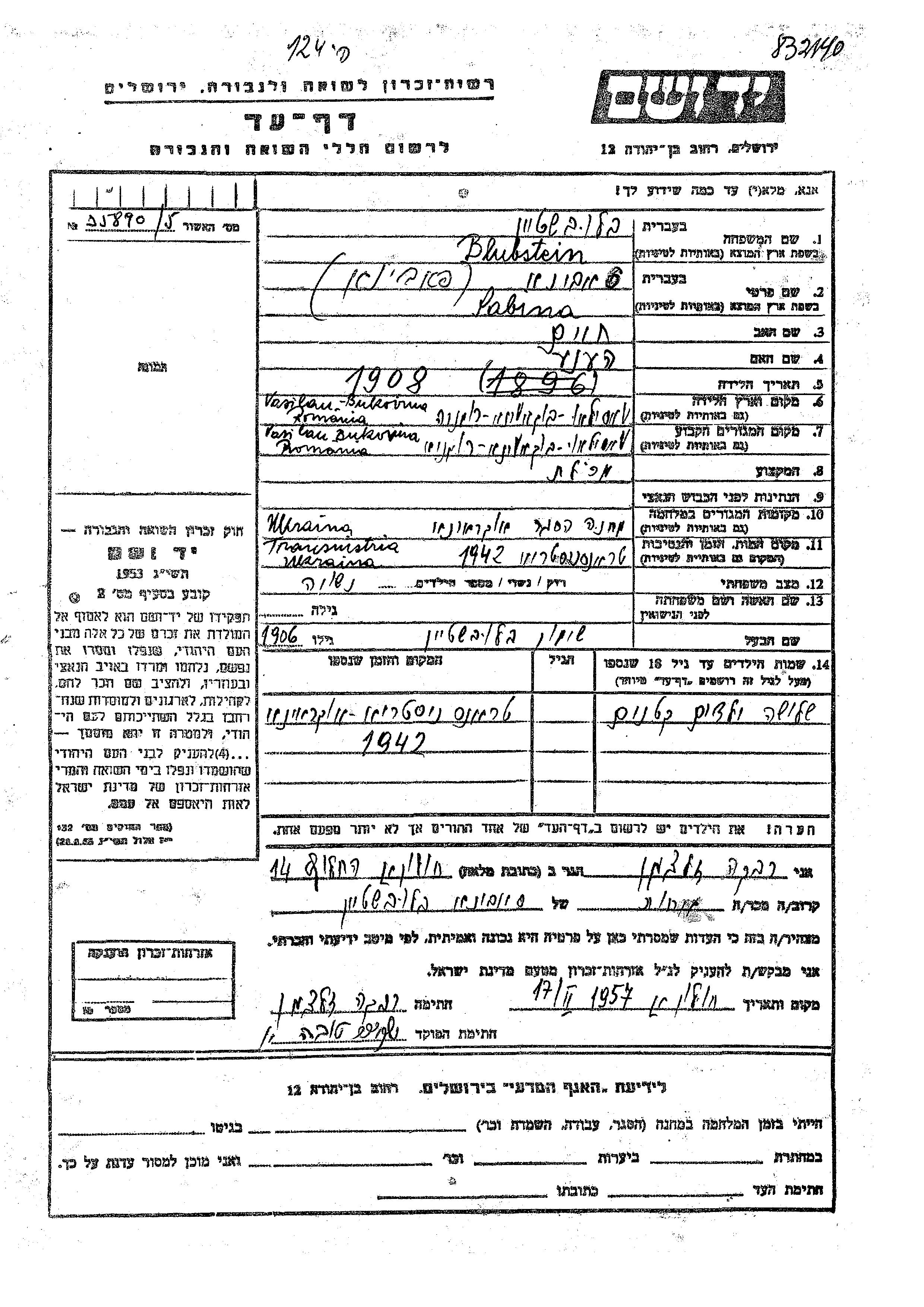 Blubstein Bluvshtein Sabina 1908 Vasilau, Rumänien Gedenkblatt
