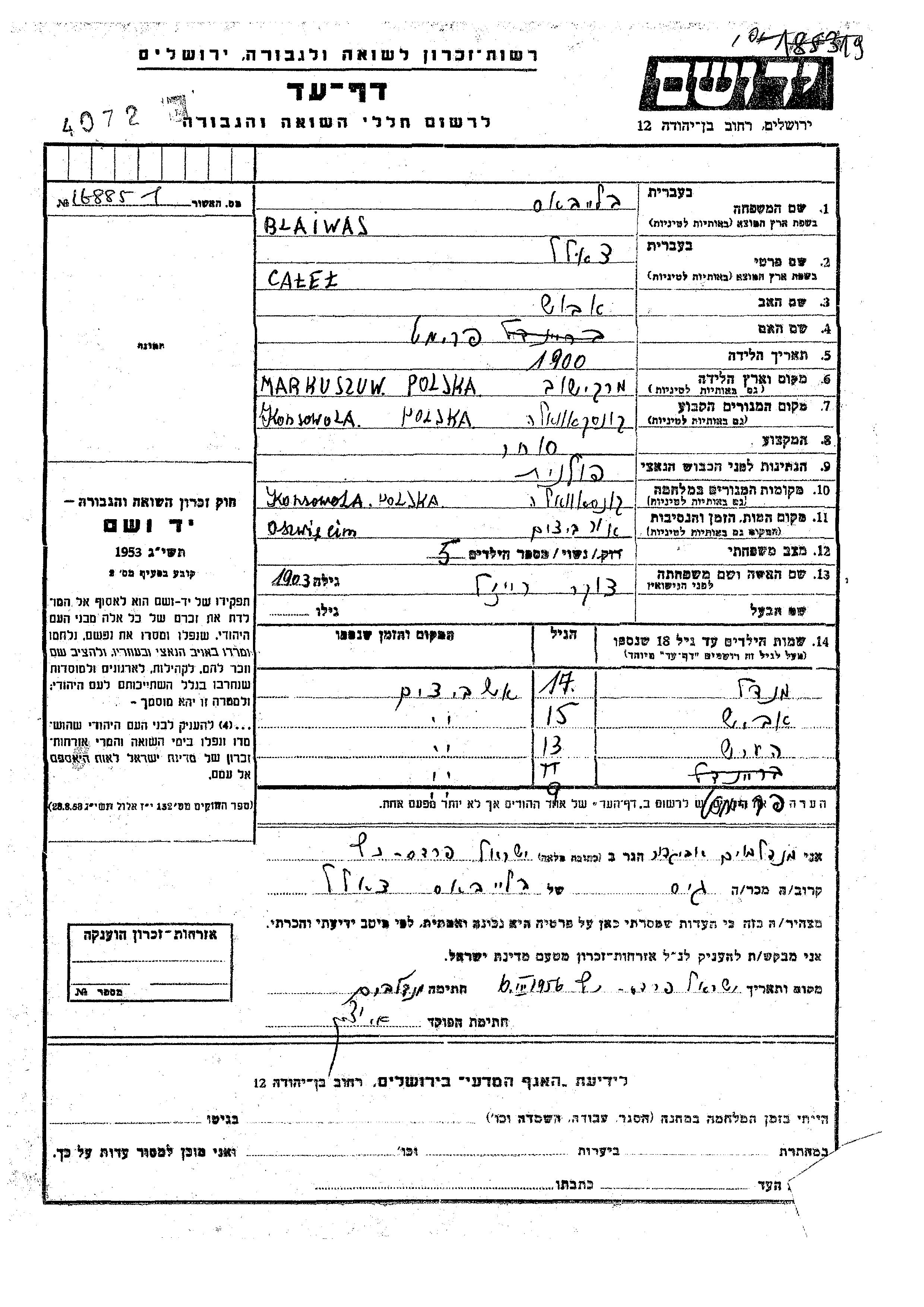 Calel Blaiwas wurde im Jahr 1900 in Markuszow, Polen geboren. Er war der Sohn von Aba und Frimet. Er war Kaufmann/-frau und mit Reizl, geb. Tzuker Verheiratet. Vor dem Zweiten Weltkrieg lebte er in Konskowola, Polen. Während des Krieges war er in Konskowola, Polen.