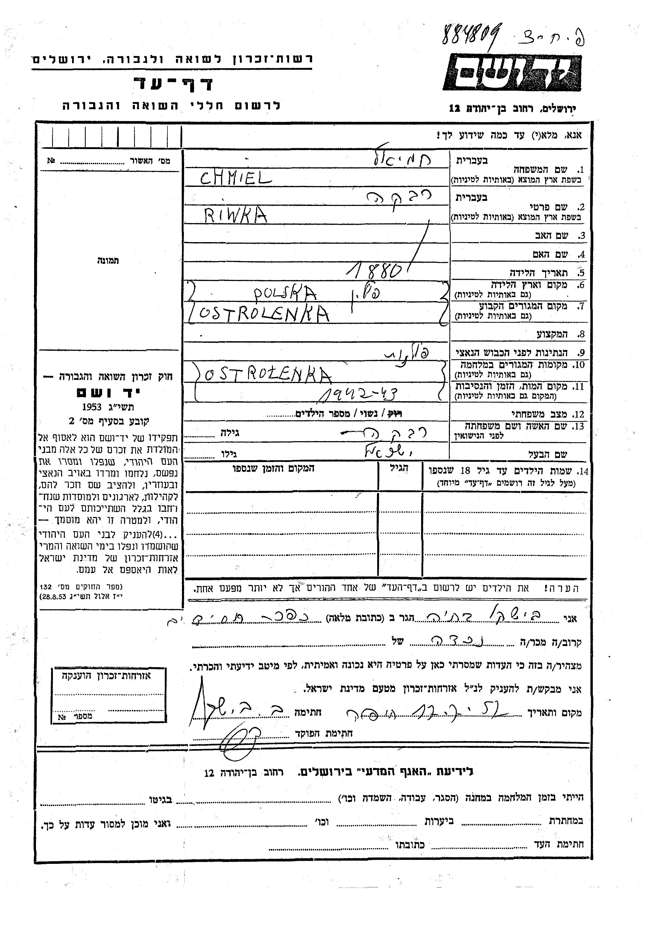 Riwka Chmiel wurde im Jahr 1880 in Ostrolenka, Polen geboren. Sie war mit Yisrael Verheiratet. Vor dem Zweiten Weltkrieg lebte sie in Ostrolenka, Polen. Während des Krieges war sie in Ostrolenka, Polen.