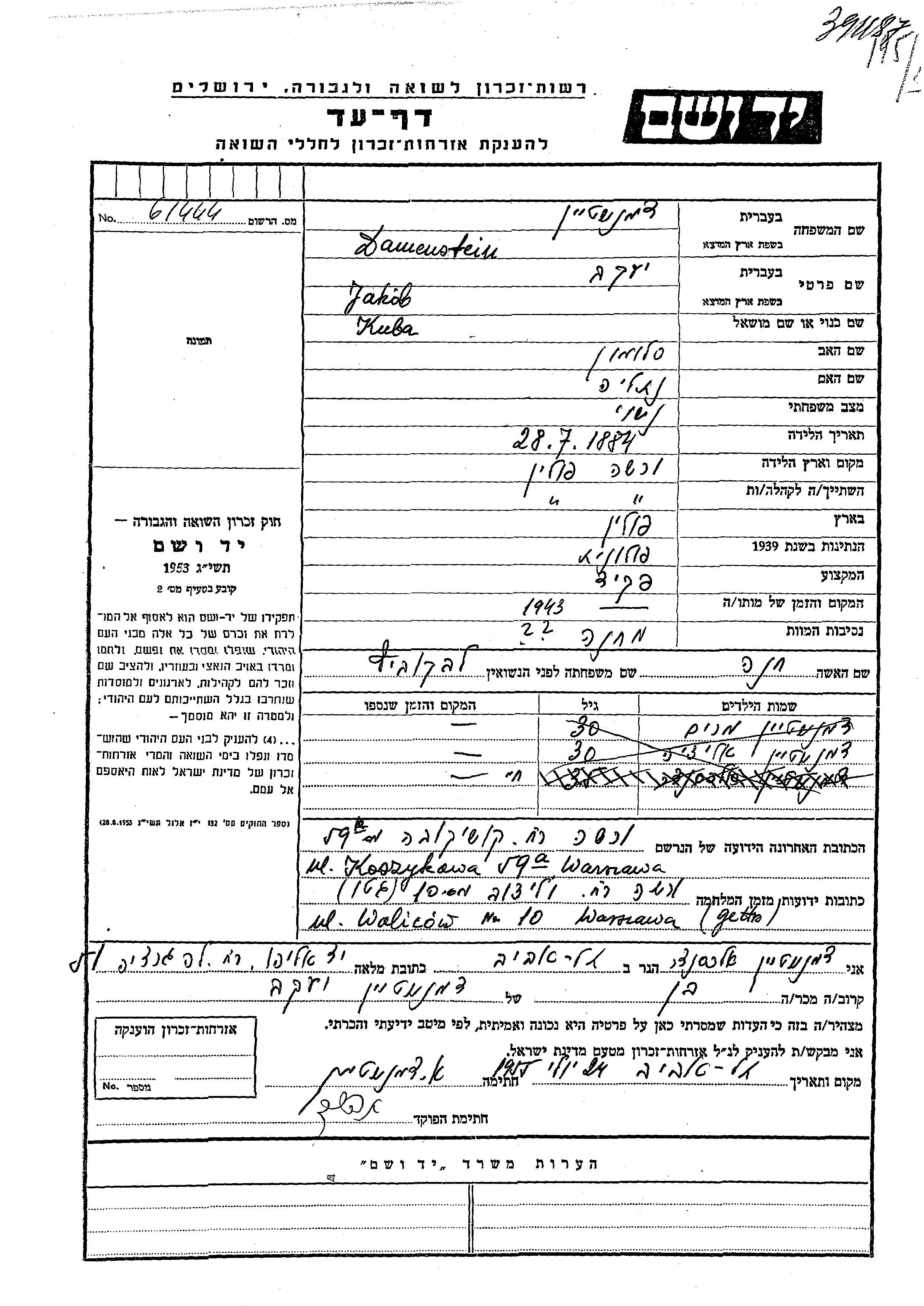 Jakob Damenstein wurde im Jahr 1884 in Warszawa, Polen geboren. Er war der Sohn von Salomon und Natalia. Er war Angestellte/-r und mit Khana, geb. Levkovitz Verheiratet. Vor dem Zweiten Weltkrieg lebte er in Polen. Während des Krieges war er in Warszawa, Polen.