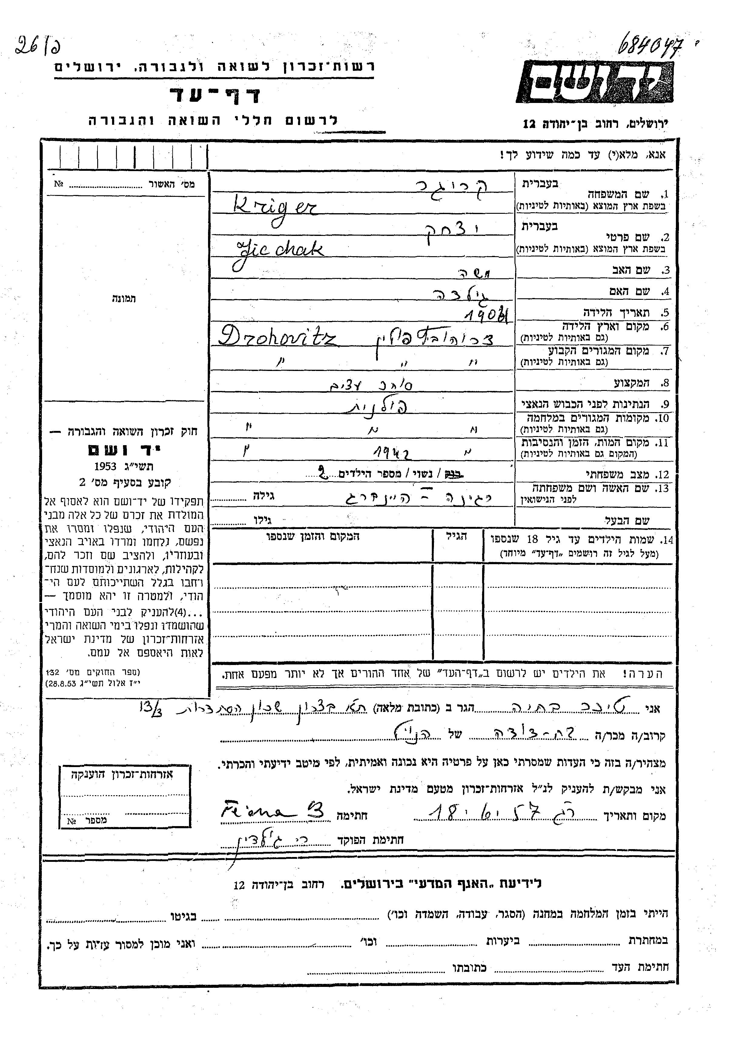 Jicchak wurde in der Schoah ermordet. Todesort: Drohobycz, Polen im Jahr 1942.