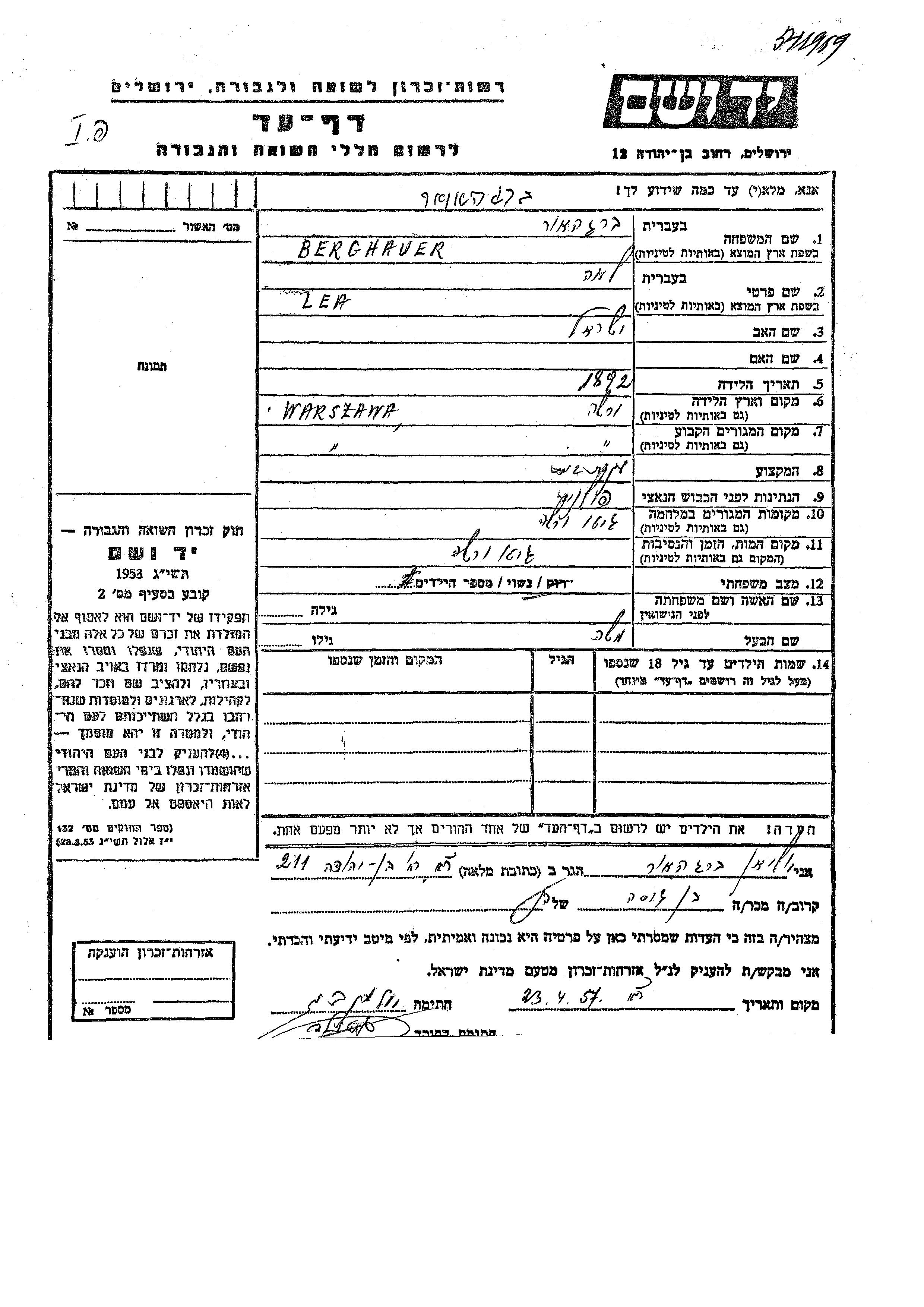 Lea Berghauer wurde im Jahr 1892 in Warsaw, Polen geboren. Sie war die Tochter von Yisrael. Sie war Hausfrau und mit Moshe Verheiratet. Vor dem Zweiten Weltkrieg lebte sie in Warsaw, Polen. Während des Krieges war sie in Warsaw, Polen.
