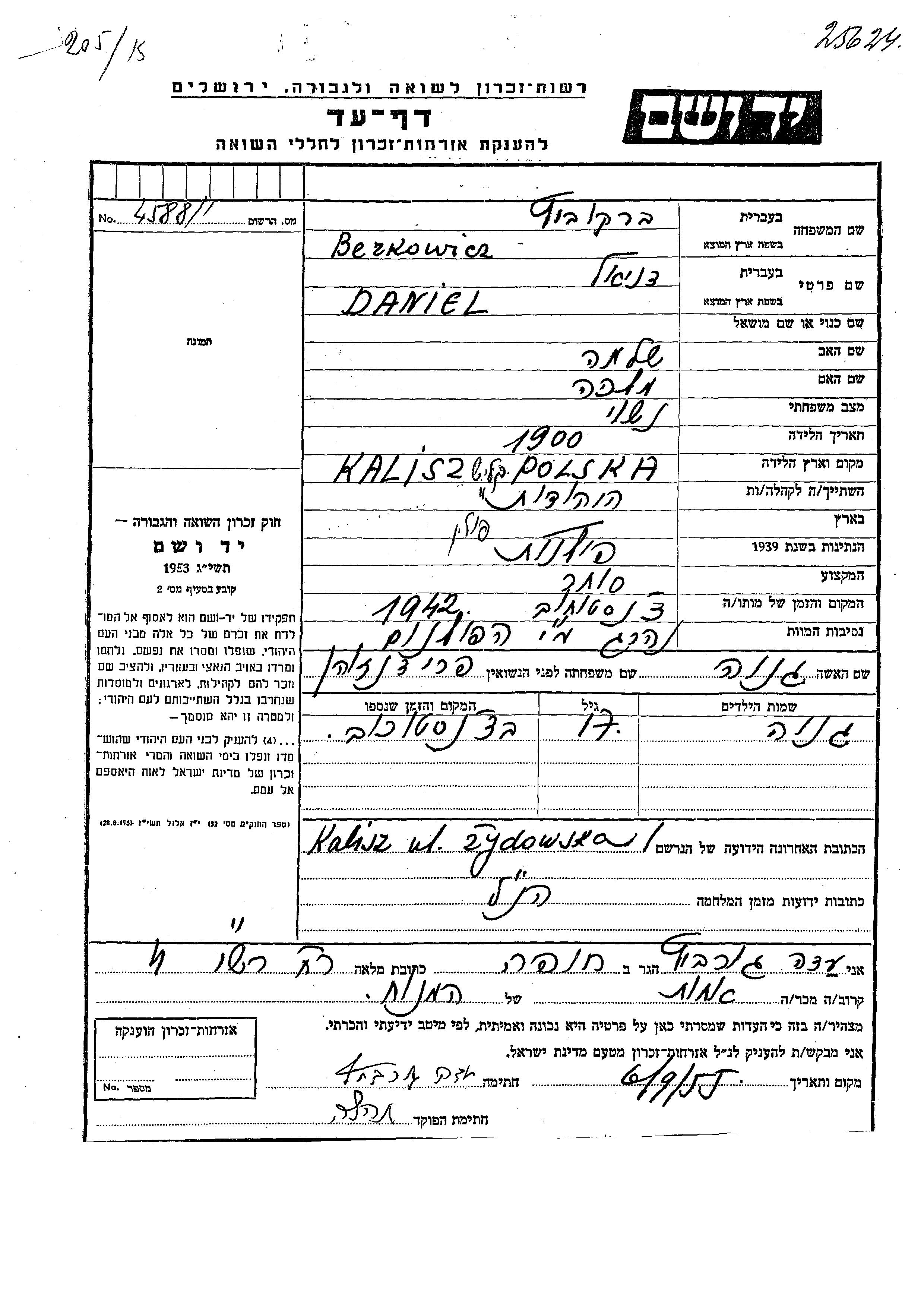 Daniel wurde in der Schoah ermordet. Todesort: Chenstochov, Polen im Jahr 1942.