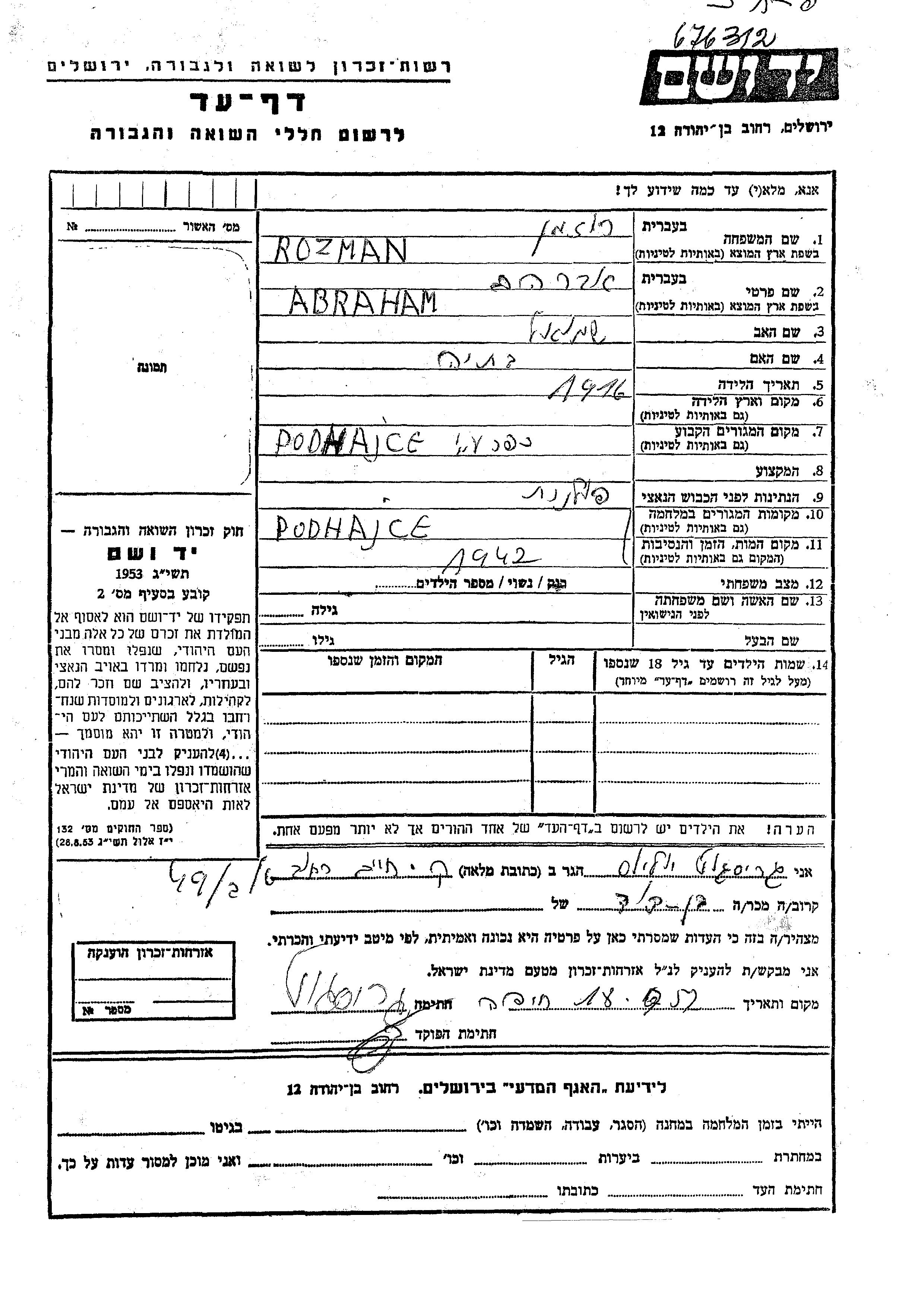 Abraham Rozman wurde im Jahr 1916 geboren. Er war der Sohn von Shmuel und Batia. Er war Verheiratet. Vor dem Zweiten Weltkrieg lebte er in Podhajce, Polen. Während des Krieges war er in Podhajce, Polen.