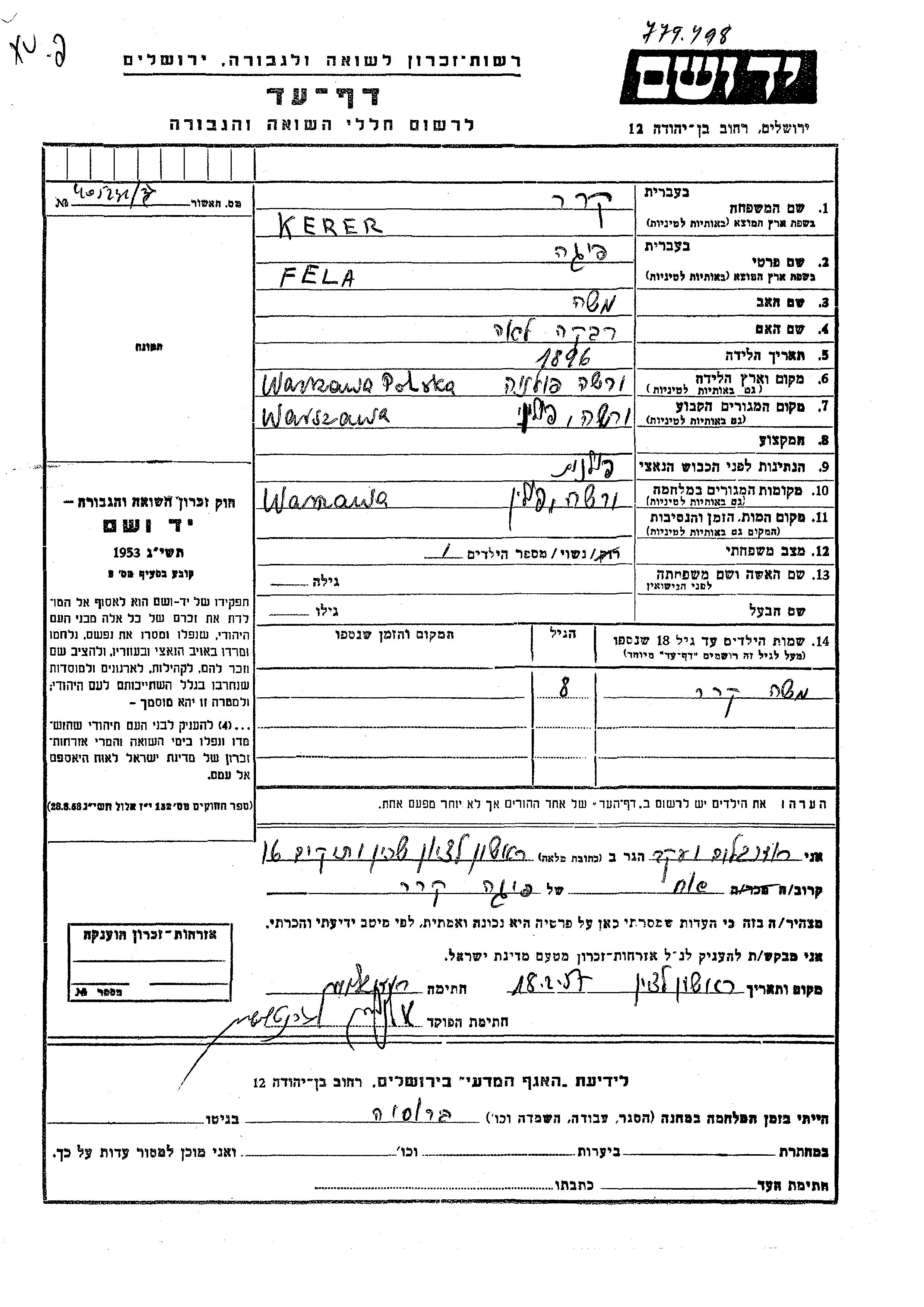 Fela Feiga Kerer wurde im Jahr 1896 in Warszawa, Polen geboren. Sie war die Tochter von Moshe und Rivka Lea. Sie war Verheiratet. Vor dem Zweiten Weltkrieg lebte sie in Warszawa, Polen. Während des Krieges war sie in Warszawa, Polen.
