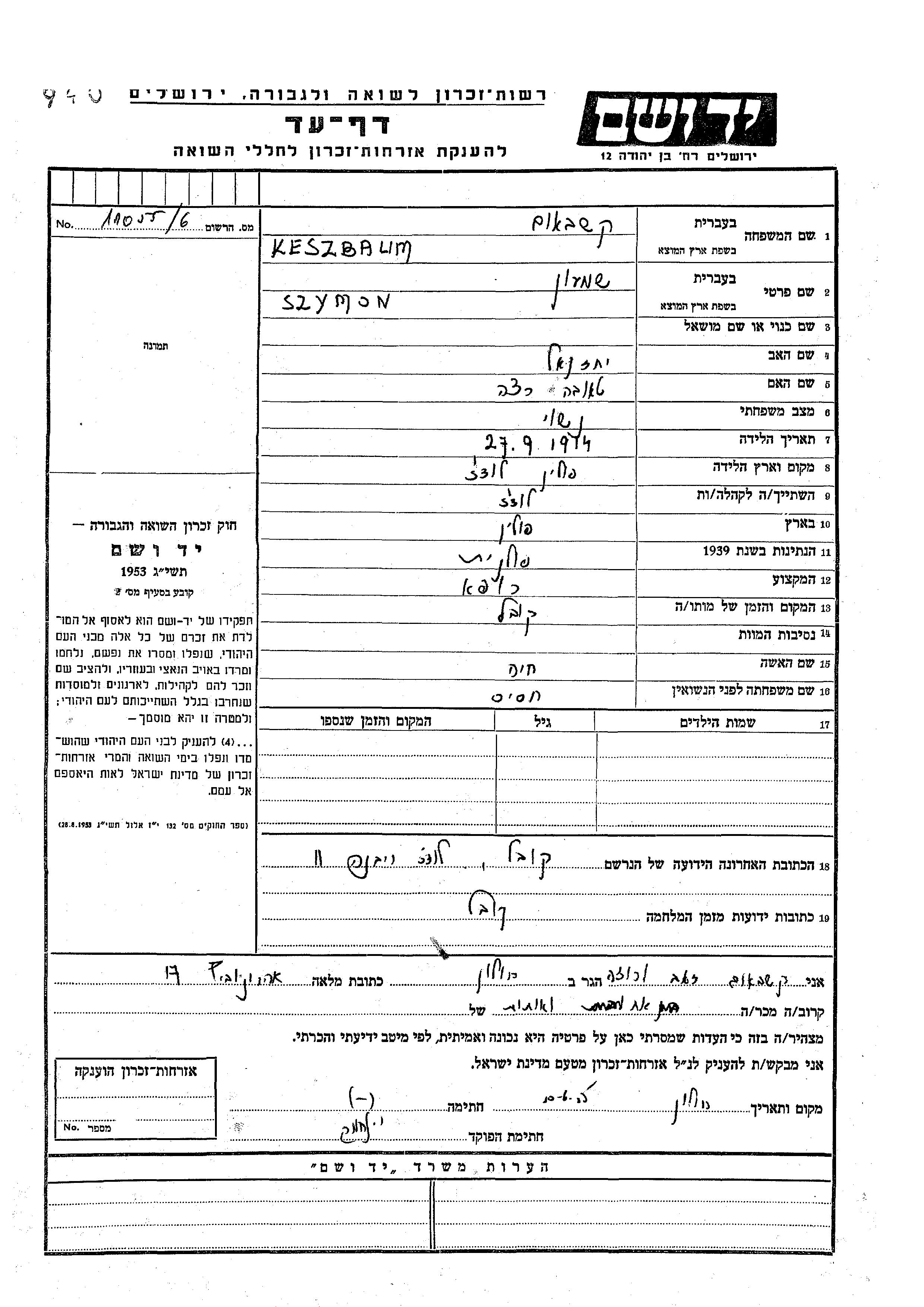 Szymon Keszbaum wurde im Jahr 1914 in Lodz, Polen geboren. Er war der Sohn von Yekhezkel und Tauba Ratza. Er war Arzt/ärztin. Vor dem Zweiten Weltkrieg lebte er in Lodz, Polen. Während des Krieges war er in Kowel, Polen.