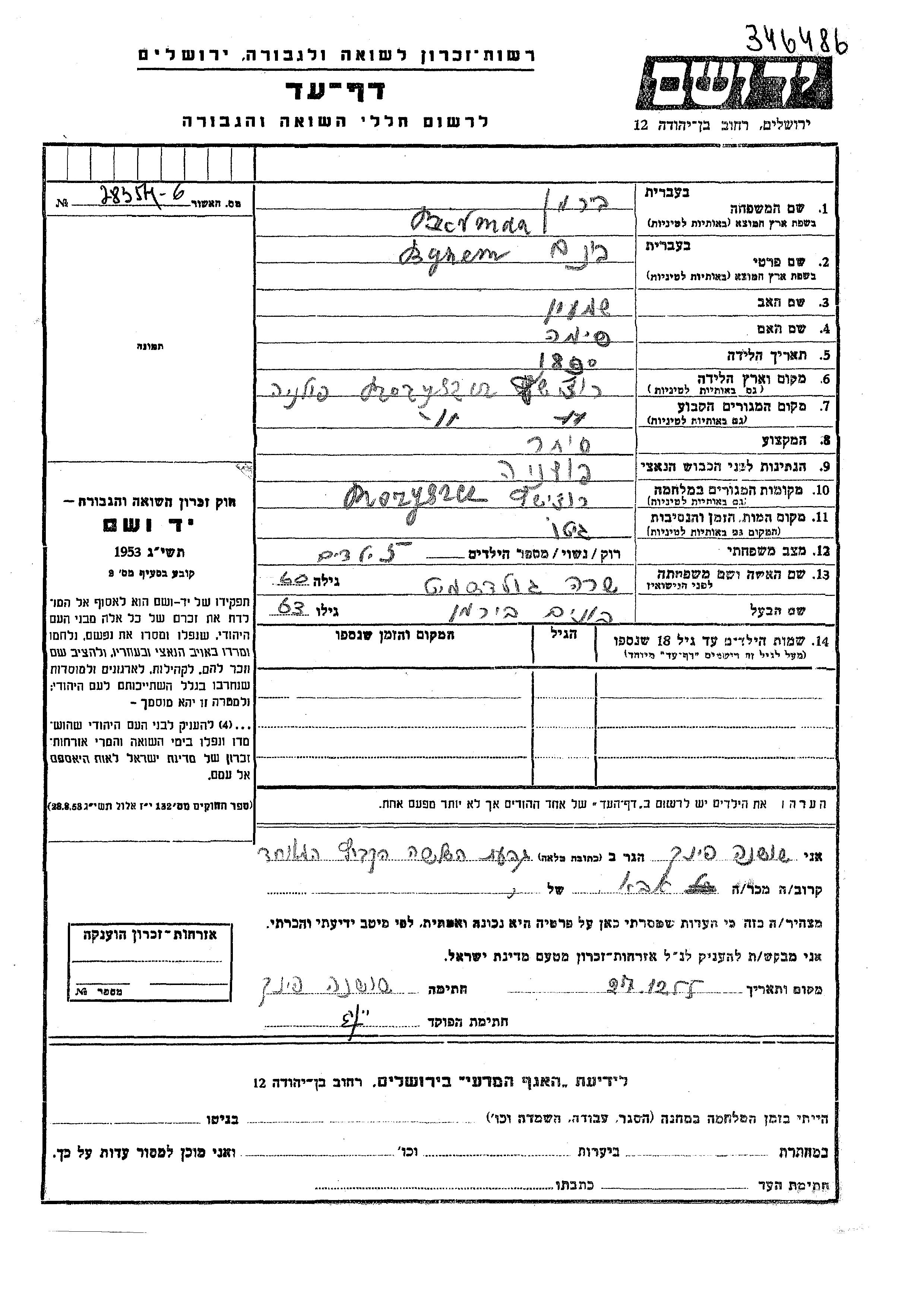 Bynem Bierman wurde im Jahr 1890 in Rozyszcze, Polen geboren. Er war der Sohn von Shimon und Sima. Er war Kaufmann/-frau und mit Sara, geb. Goldshmit Verheiratet. Vor dem Zweiten Weltkrieg lebte er in Rozyszcze, Polen. Während des Krieges war er in Rozyszcze, Polen.
