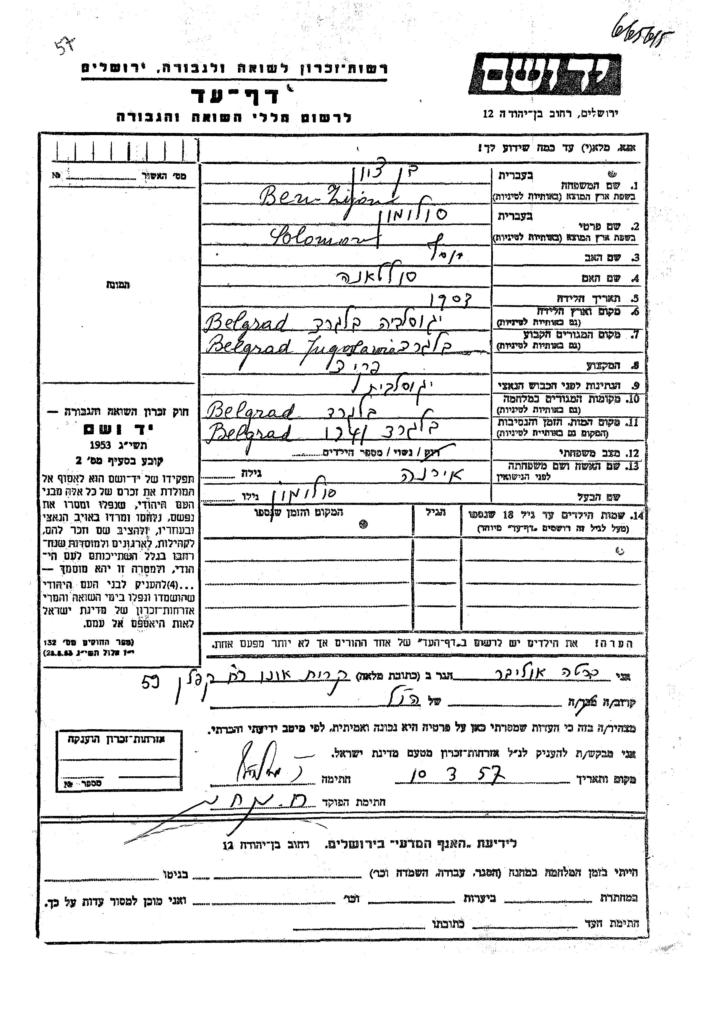 Solomon Ben Tzion wurde im Jahr 1903 in Belgrade, Jugoslawien geboren. Er war der Sohn von Yosef und Sultana. Er war Angestellte/-r und mit Irena Verheiratet. Vor dem Zweiten Weltkrieg lebte er in Belgrade, Jugoslawien. Während des Krieges war er in Belgrade, Jugoslawien.