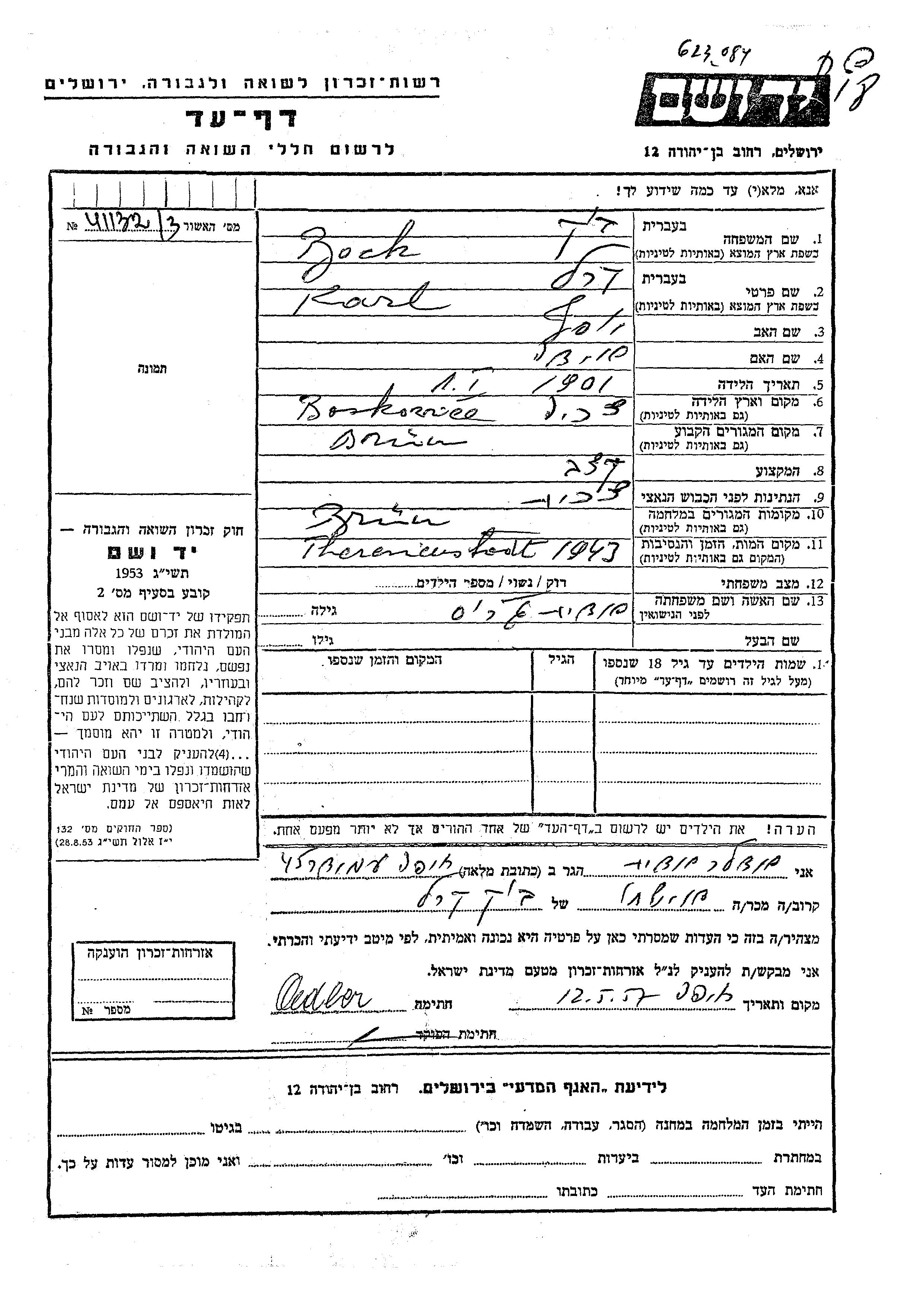 Karl Bock Buk wurde im Jahr 1901 in Boskovice, Tschechoslowakei geboren. Er war der Sohn von Yosef und Ida. Er war Metzger/-in und mit Edit, geb. Gros Verheiratet. Vor dem Zweiten Weltkrieg lebte er in Brunn, Tschechoslowakei. Während des Krieges war er in Brunn, Tschechoslowakei.