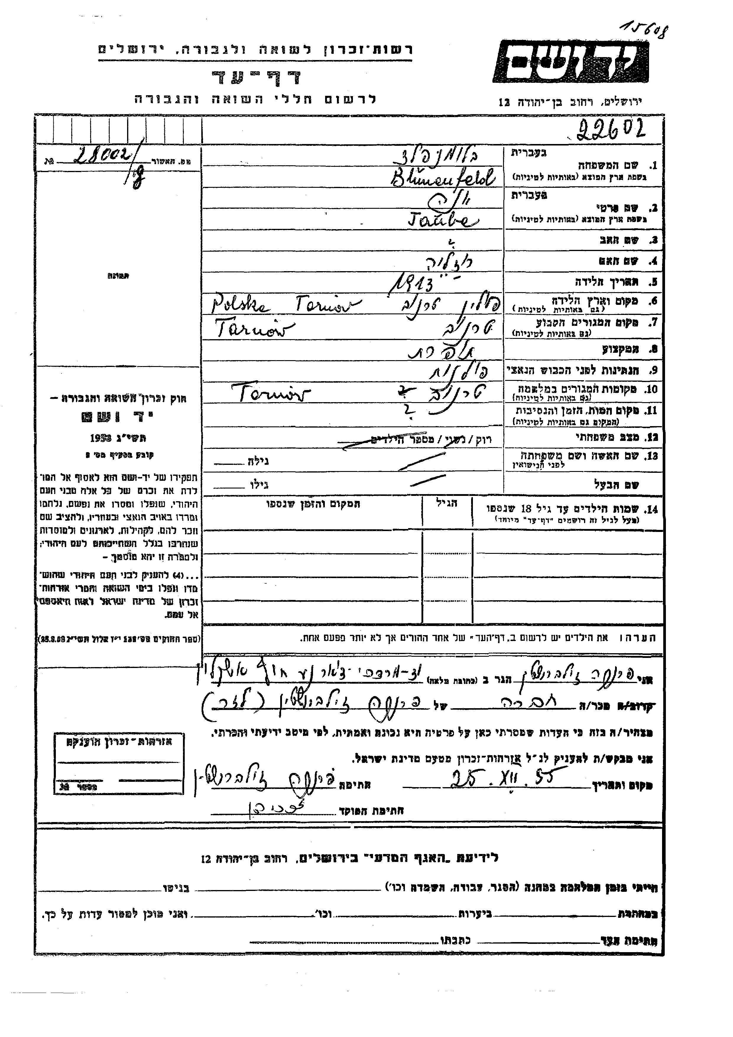 Tauba Yona Blumenfeld wurde im Jahr 1913 in Tarnow, Polen geboren. Sie war die Tochter von Rozalia. Sie war Schneiderin und Ledig. Vor dem Zweiten Weltkrieg lebte sie in Tarnow, Polen. Während des Krieges war sie in Tarnow, Polen.