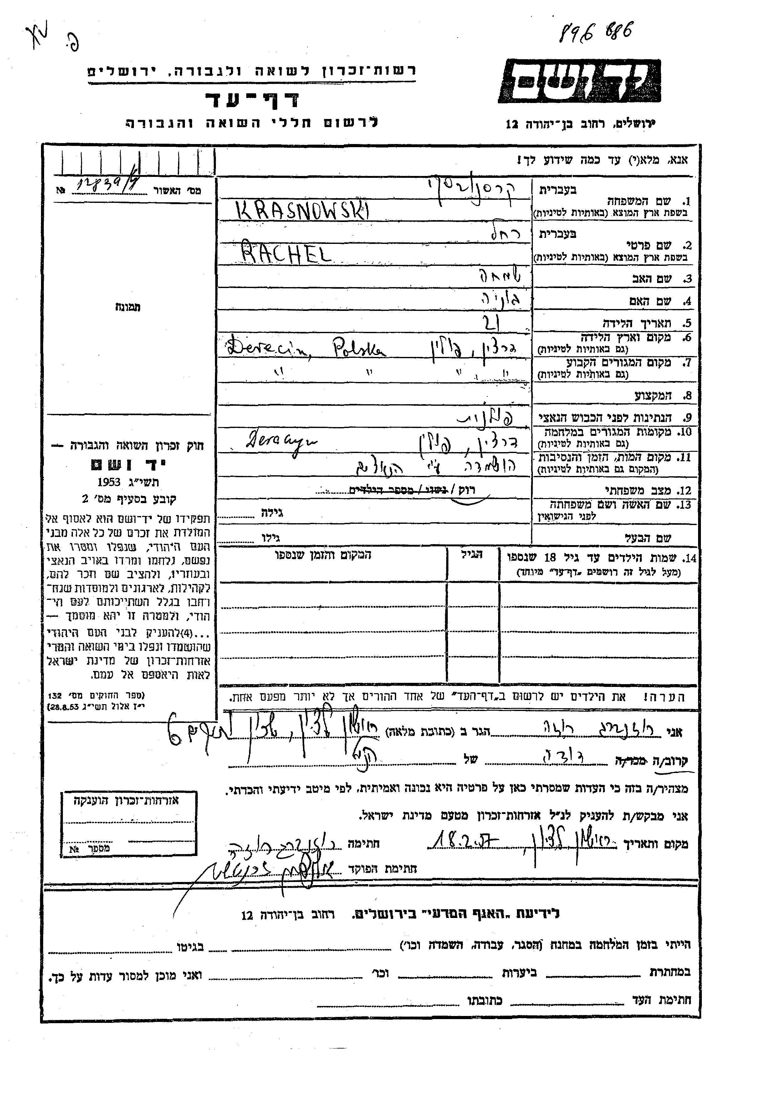 Rachel Krasnowski wurde in Derechin, Polen geboren. Sie war die Tochter von Simkha und Bunia. Sie war Ledig. Vor dem Zweiten Weltkrieg lebte sie in Derechin, Polen. Während des Krieges war sie in Derechin, Polen.