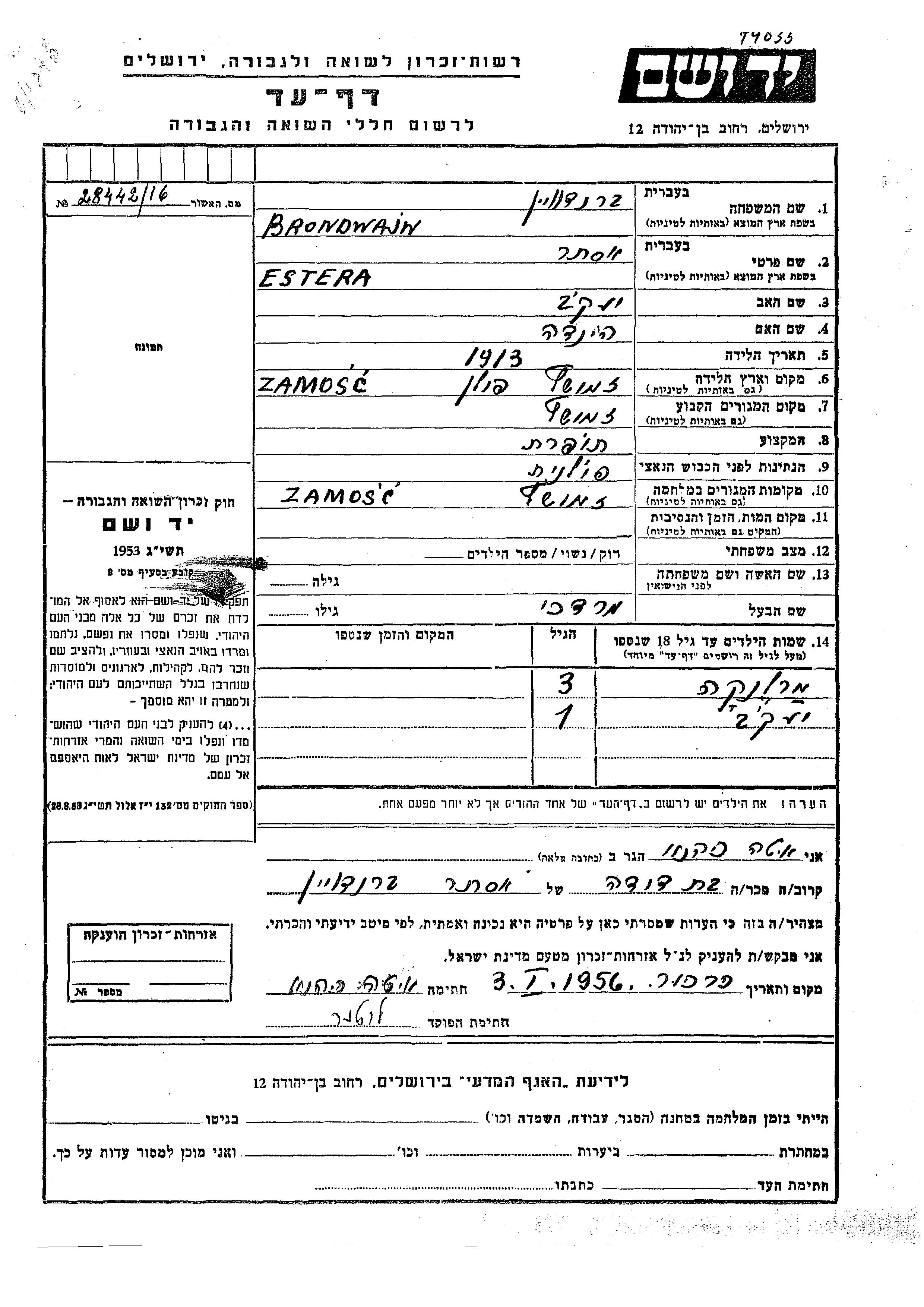 Brondwajn Estera 1913 Zamosc, Polen Gedenkblatt