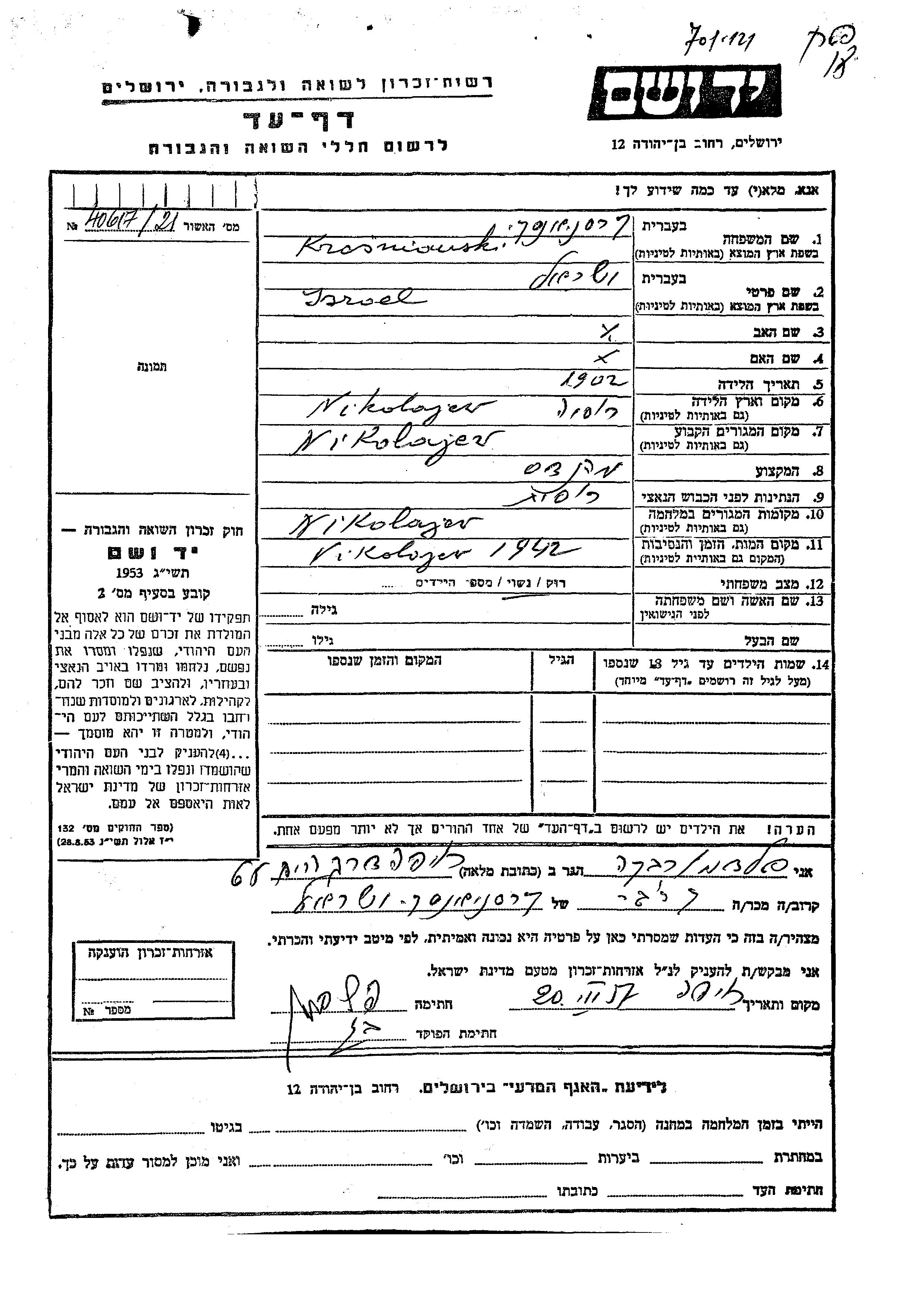 Ysrael Krasnianski wurde im Jahr 1902 in Nikolayev, Ukraine (UdSSR) geboren. Er war Ingenieur und Verheiratet. Vor dem Zweiten Weltkrieg lebte er in Nikolayev, Ukraine (UdSSR). Während des Krieges war er in Nikolayev, Ukraine (UdSSR).