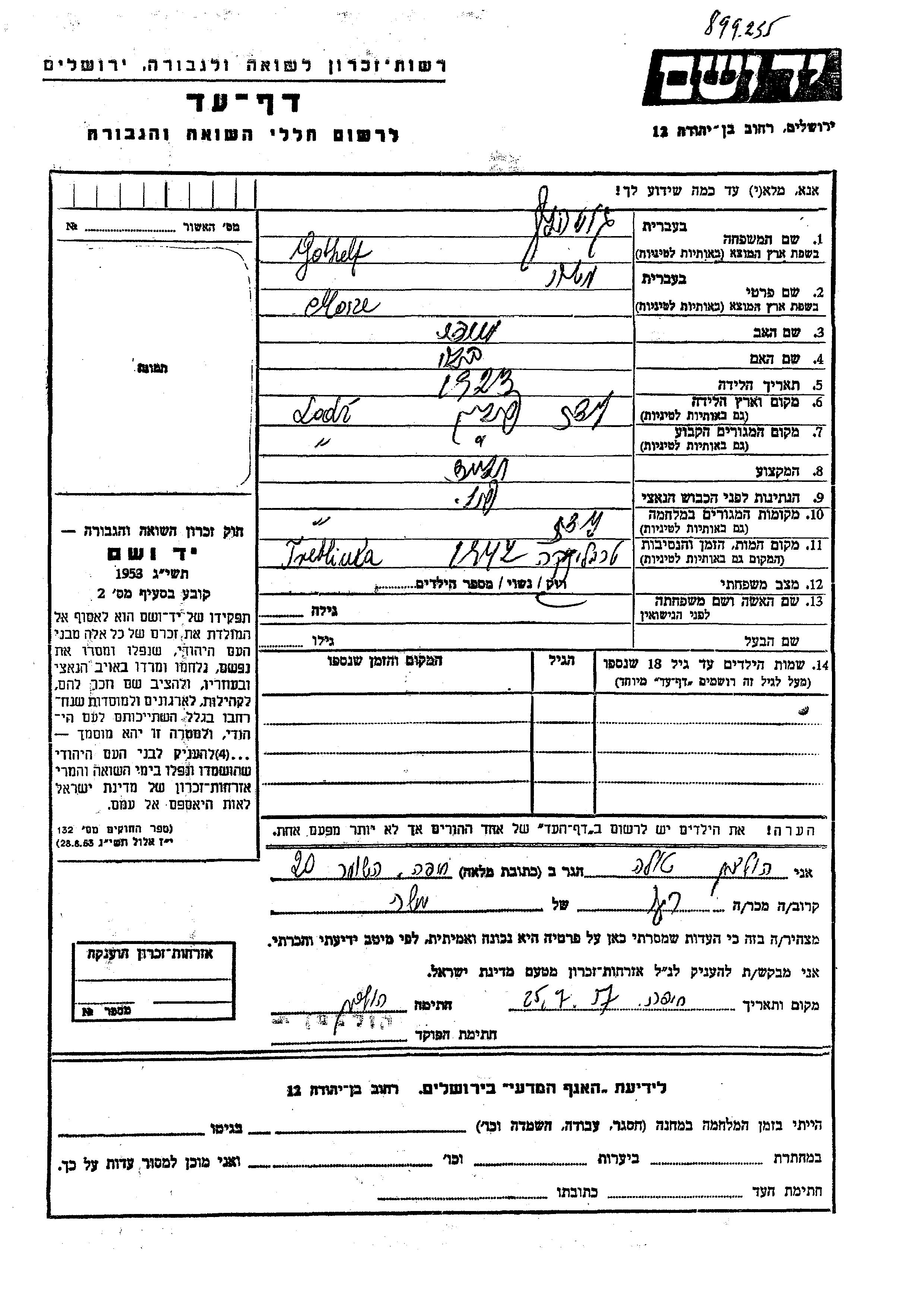 Mosze Gothelf wurde im Jahr 1923 in Lodz, Polen geboren. Er war der Sohn von Mordekhai und Beti. Er war Schüler/-in und Ledig. Vor dem Zweiten Weltkrieg lebte er in Lodz, Polen. Während des Krieges war er in Lodz, Polen.