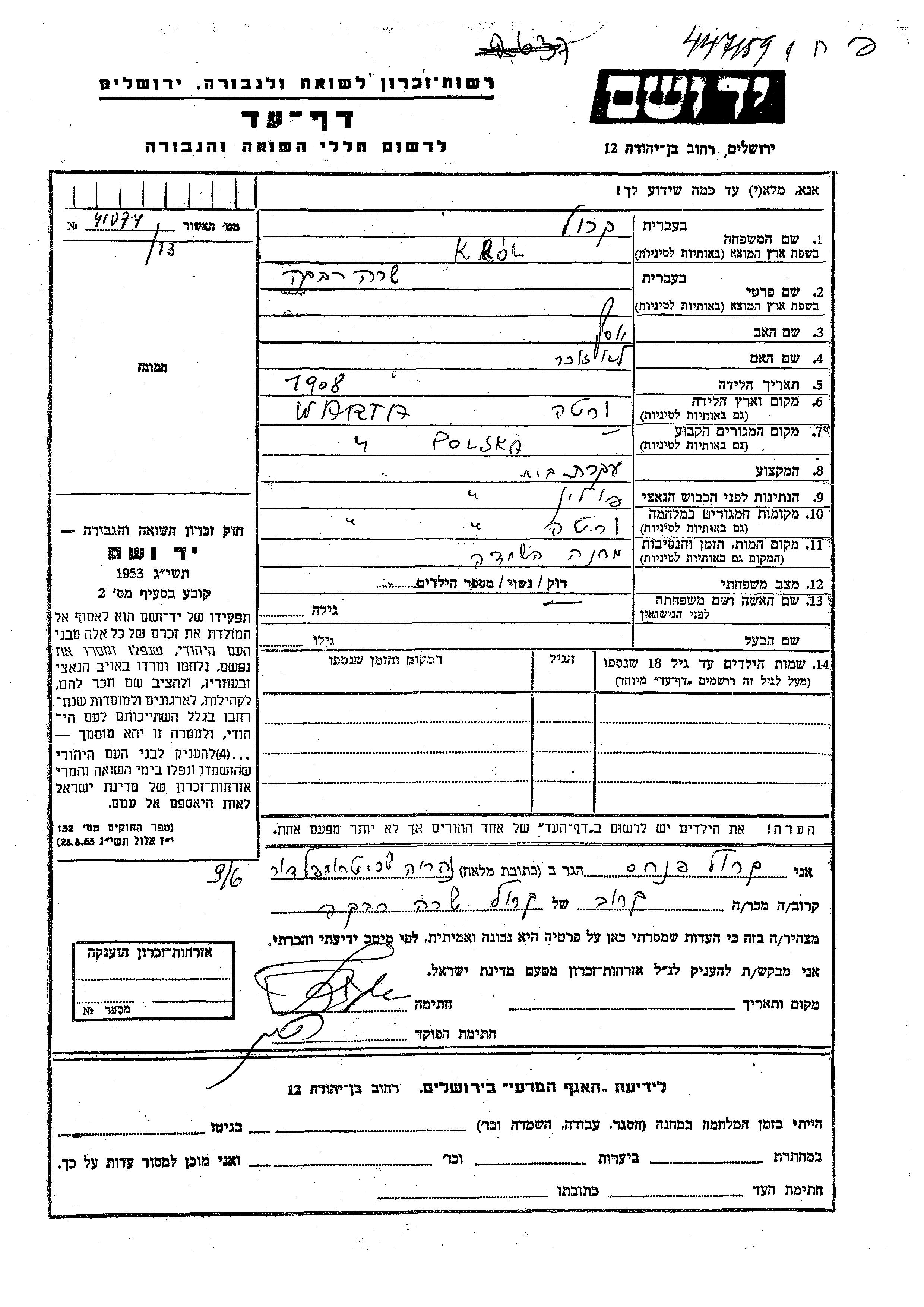 Sara Rivka Krol wurde im Jahr 1908 in Warta, Polen geboren. Sie war die Tochter von Yosef. Sie war Hausfrau und Ledig. Vor dem Zweiten Weltkrieg lebte sie in Warta, Polen. Während des Krieges war sie in Warta, Polen.