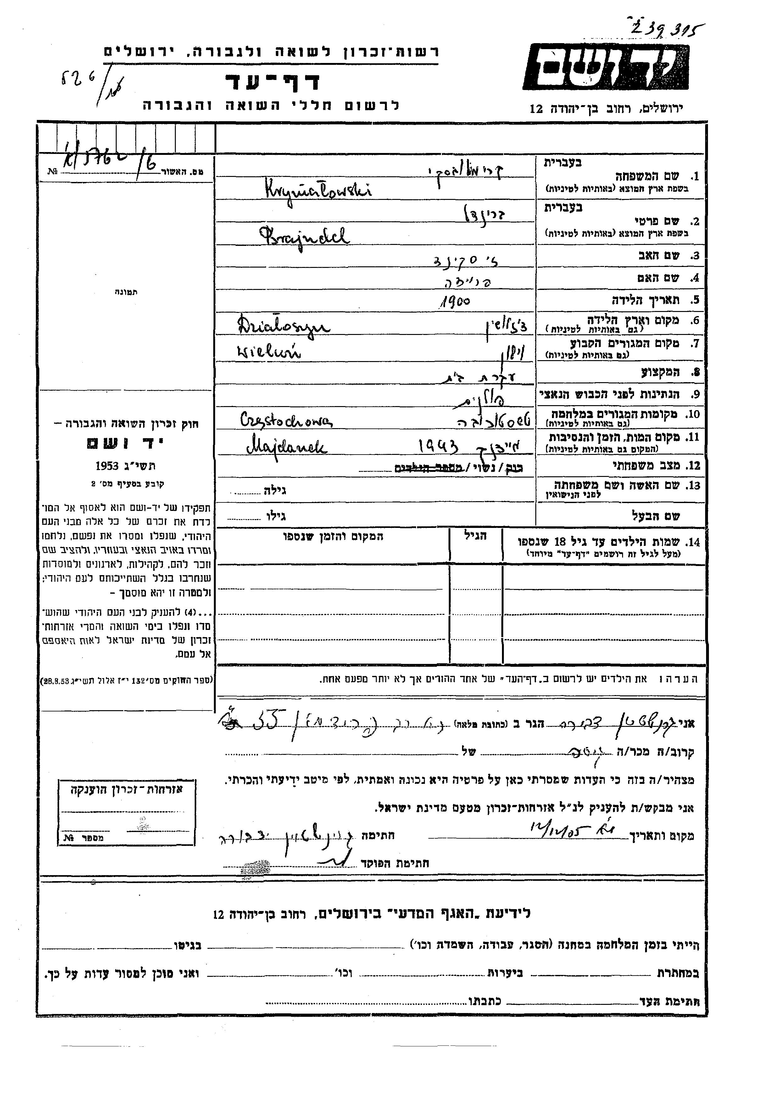 Brajndel Krymalowski wurde im Jahr 1900 in Dzialoszyn, Polen geboren. Sie war die Tochter von Ziskind und Freida. Sie war Hausfrau und Verheiratet. Vor dem Zweiten Weltkrieg lebte sie in Wielun, Polen. Während des Krieges war sie in Czestochowa, Polen.