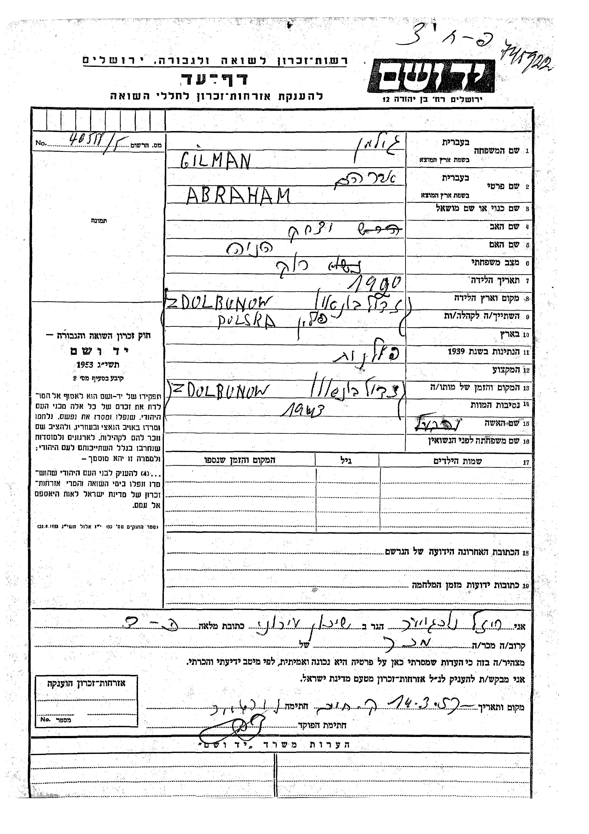 Abraham Gilman wurde im Jahr 1920 in Zdolbunow, Polen geboren. Er war der Sohn von Yitzkhak und Henia.