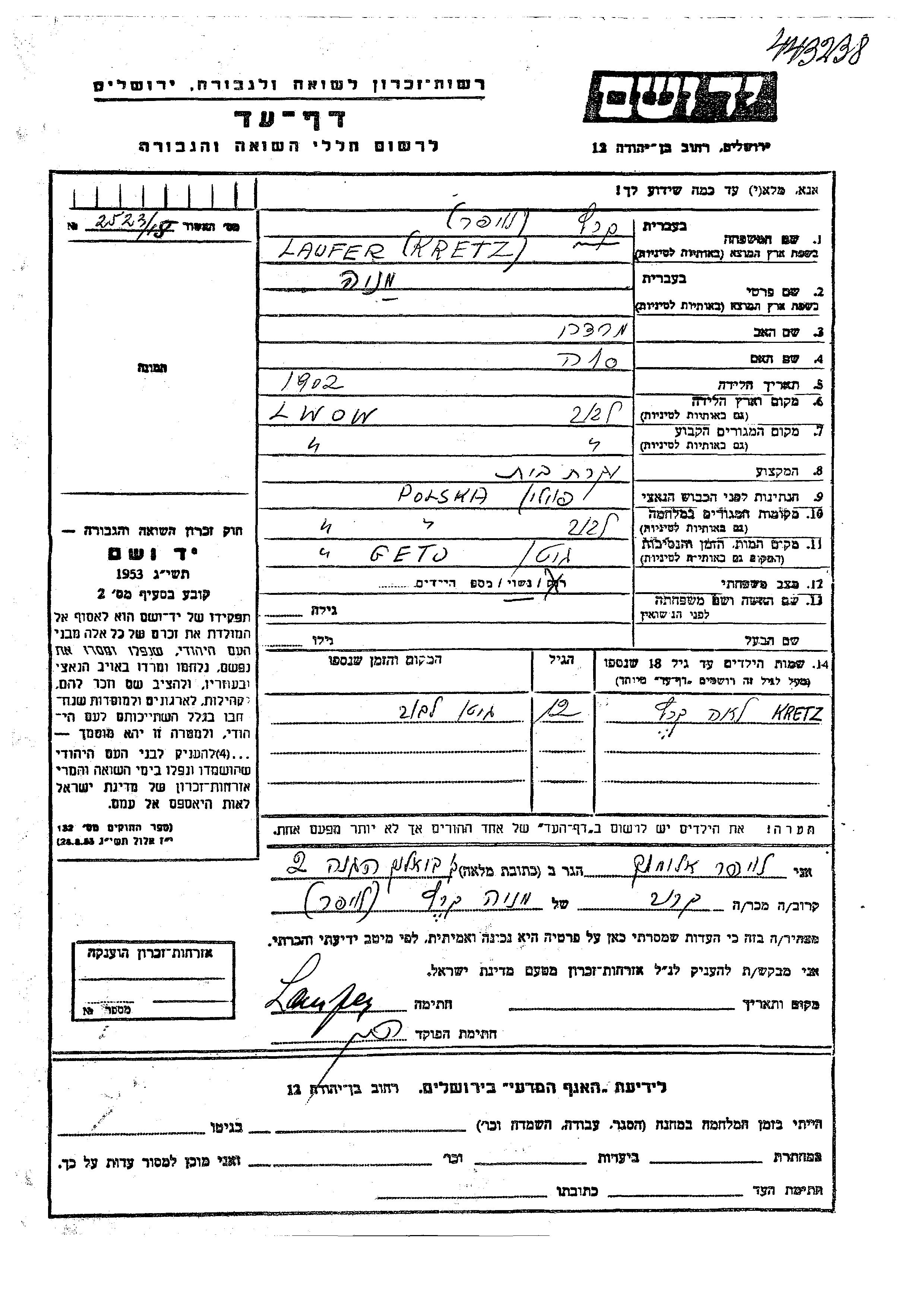 Mania Laufer Kretz wurde im Jahr 1902 in Lwow, Polen geboren. Er/sie war der/ die Sohn/Tochter von Mordekhai und Sala. Er/Sie war Hausfrau und Verheiratet Vor dem Zweiten Weltkrieg er/sie in Lwow, Polen. Während des Krieges war er/sie in Lwow, Polen.