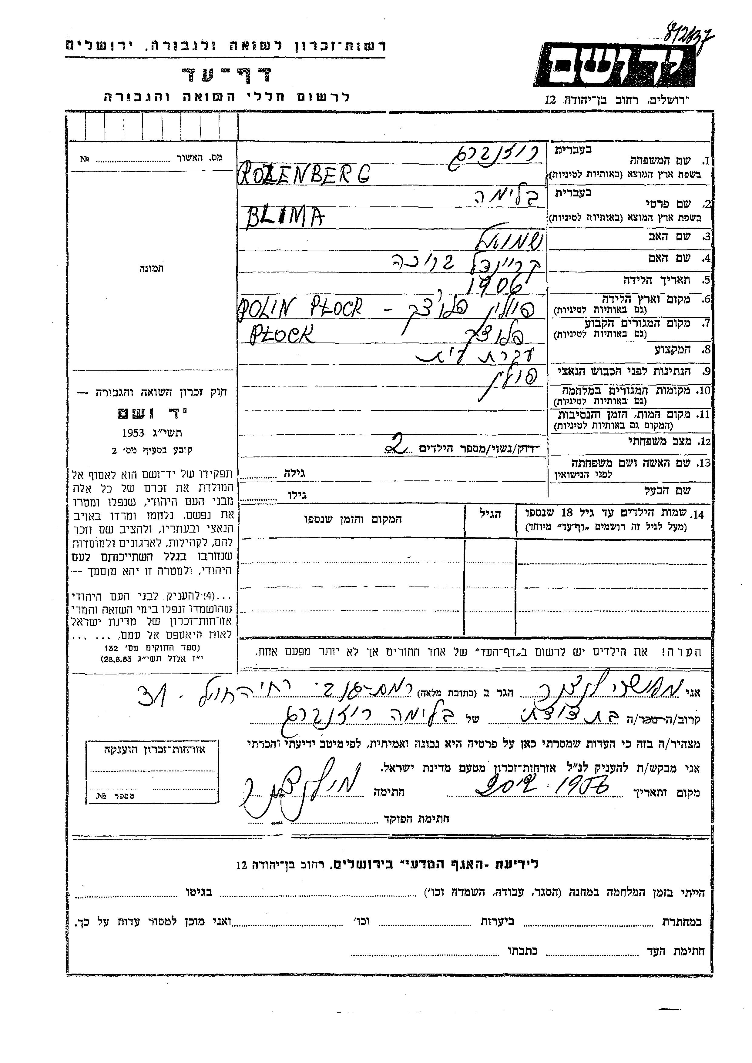 Blima Rozenberg wurde im Jahr 1906 in Plock, Polen geboren. Sie war die Tochter von Shmuel und Kreindel Brakha. Sie war Hausfrau und Verheiratet. Vor dem Zweiten Weltkrieg lebte sie in Plock, Polen.