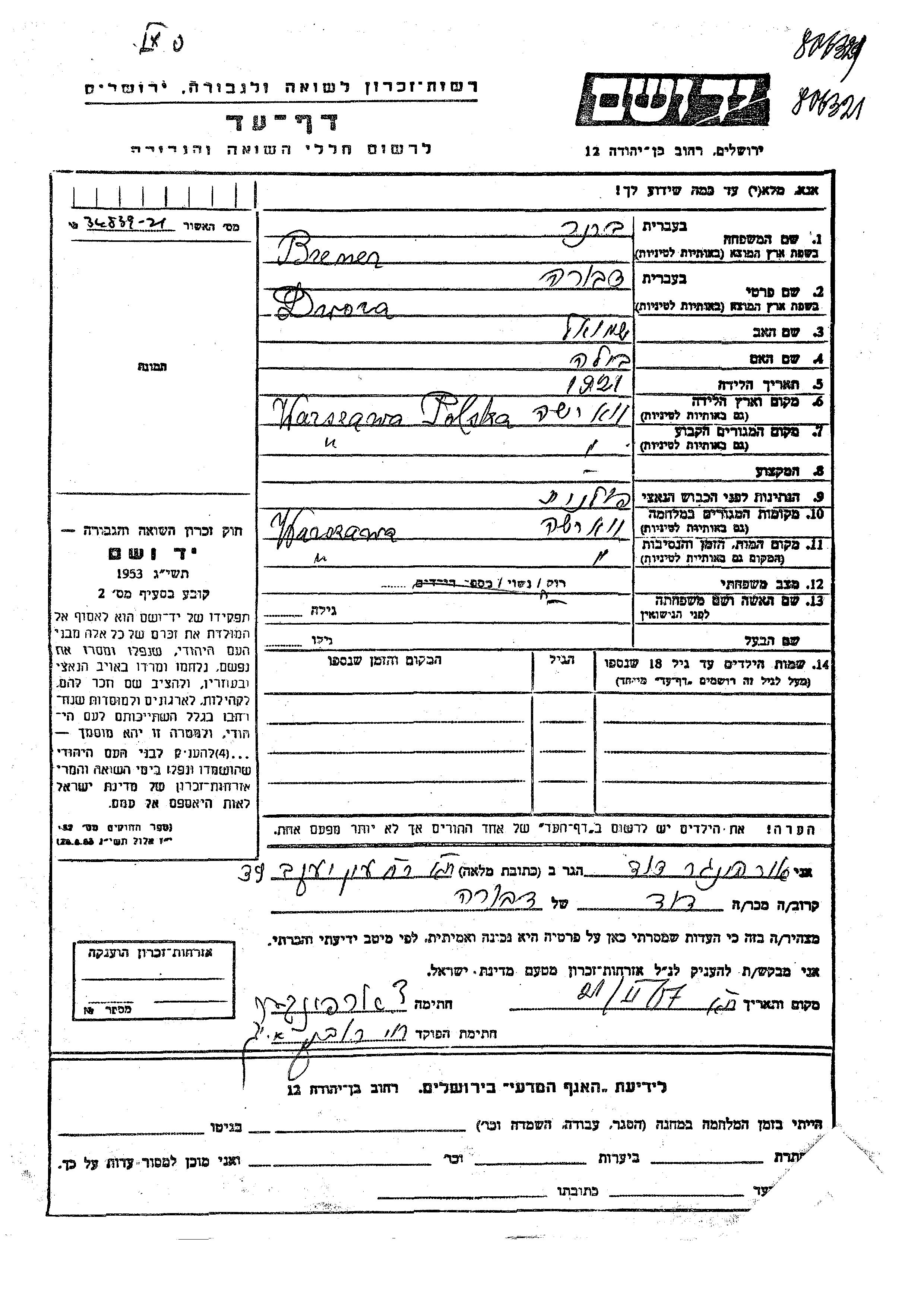 Dwora Brener wurde im Jahr 1921 in Warsaw, Polen geboren. Sie war die Tochter von Shmuel und Bila. Sie war Ledig. Vor dem Zweiten Weltkrieg lebte sie in Warsaw, Polen. Während des Krieges war sie in Warsaw, Polen.