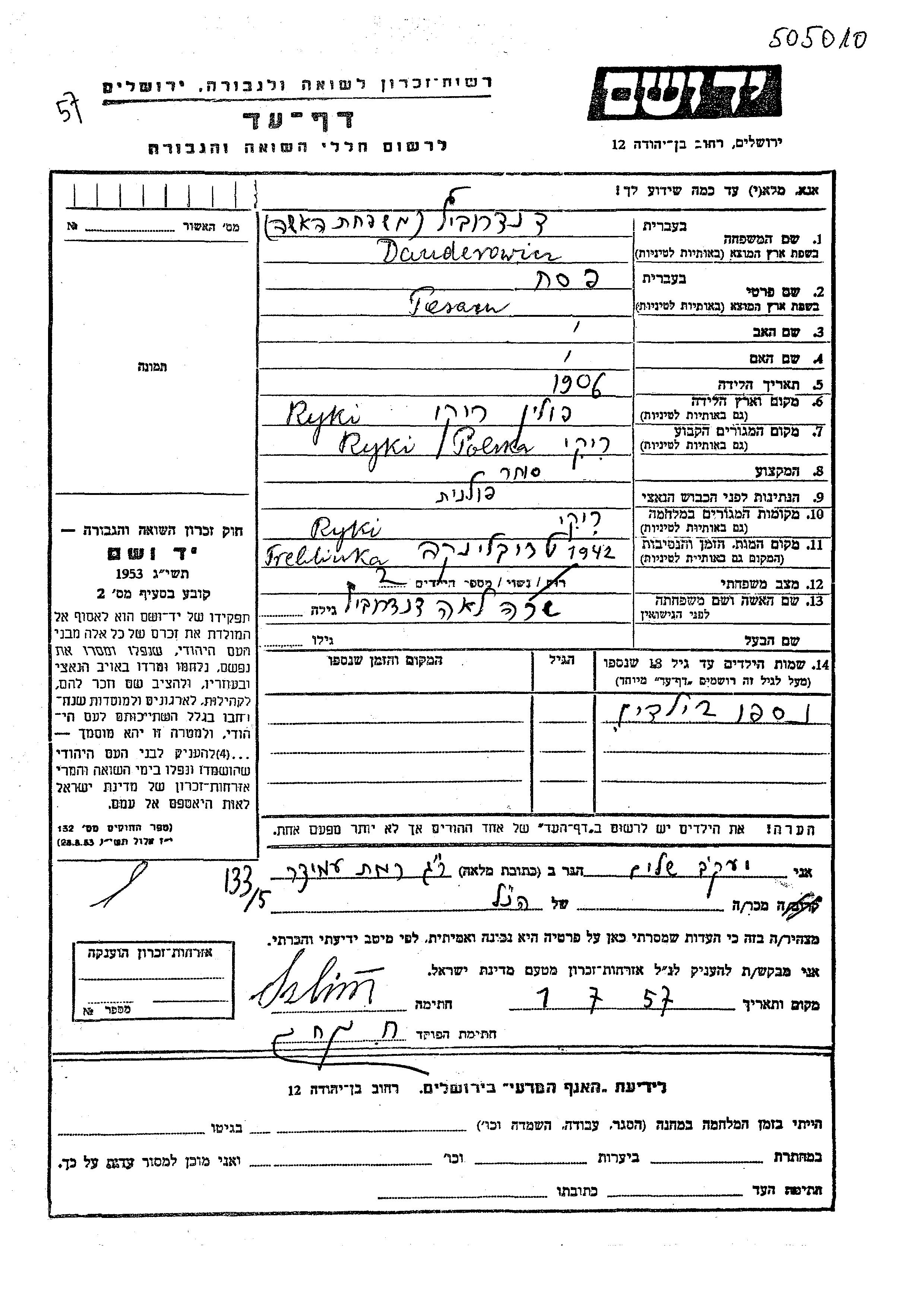 Pesach Name unbekannt wurde im Jahr 1906 in Ryki, Polen geboren. Er war Kaufmann/-frau und mit Sara Lea, geb. Danderowicz Verheiratet. Vor dem Zweiten Weltkrieg lebte er in Ryki, Polen. Während des Krieges war er in Ryki, Polen.